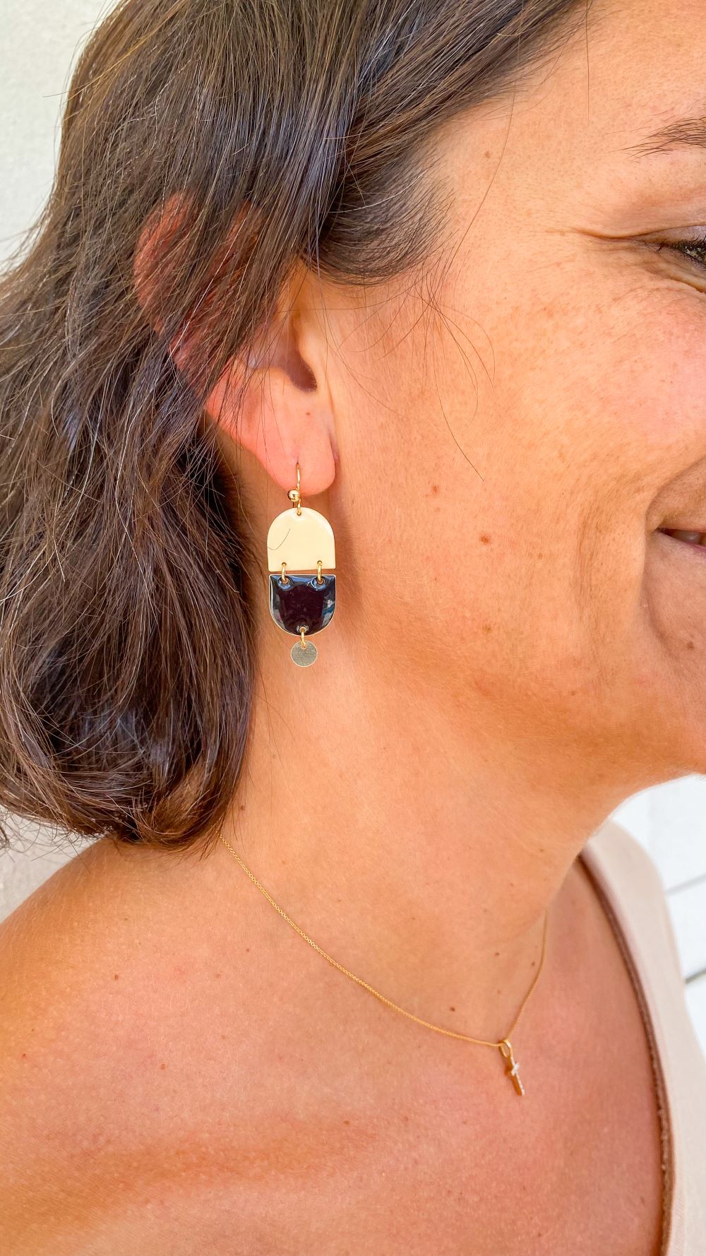 Pour parfaire cette paire de boucles d’oreilles, une pastille en gold field est délicatement suspendue, apportant une touche d’éclat chaleureux au milieu de la sobriété du noir et du blanc. Cette pastille représente la luminosité au cœur de l’élégance monochrome.