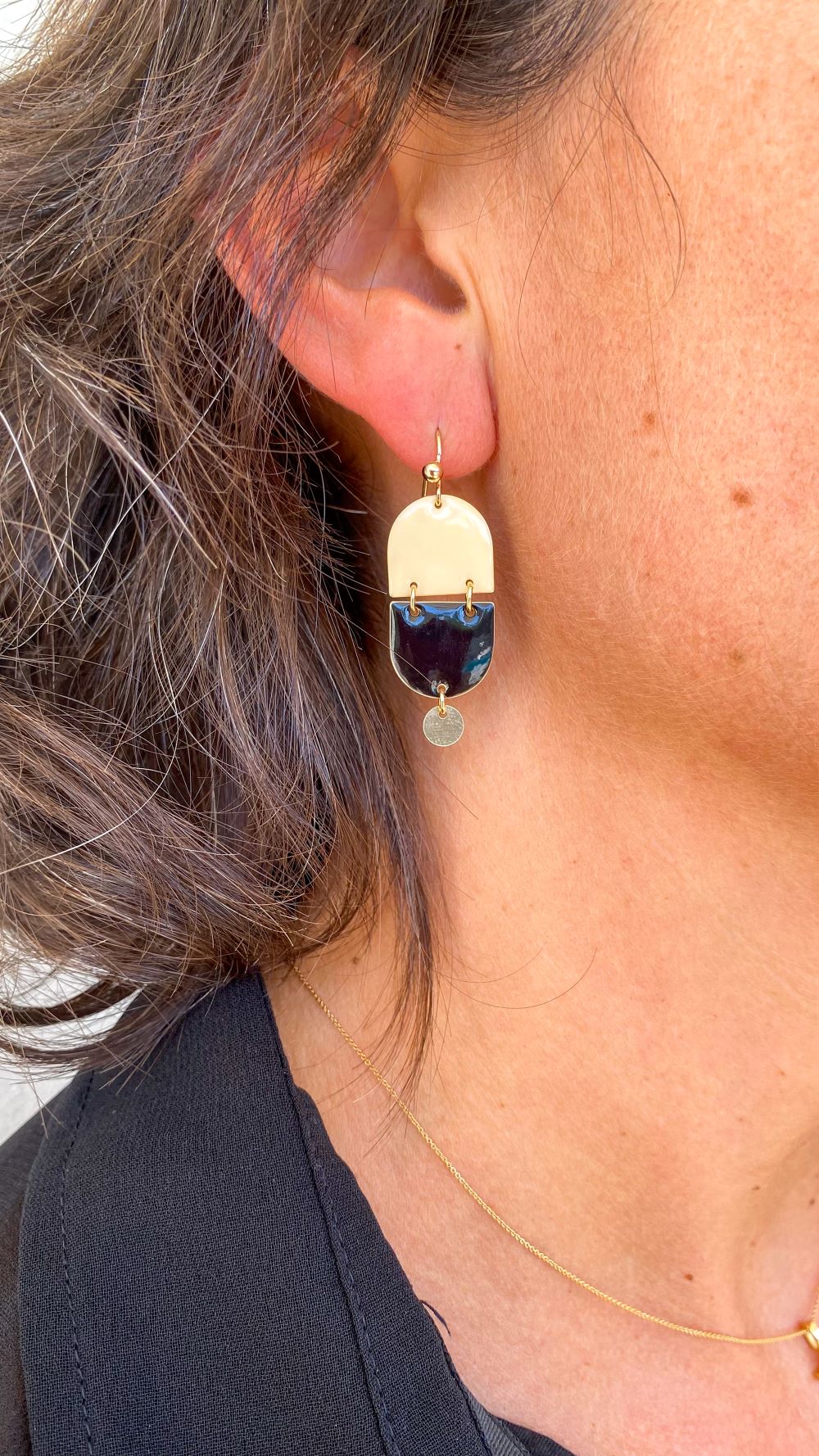 La pièce maîtresse de cette paire de boucles d’oreilles est la combinaison audacieuse de deux demi – ovales en laiton, l’un blanc et l’autre noir. Cette dualité crée un contraste saisissant qui évoque l’harmonie du yin et du yang, de la nuit et du jour. Le design épuré et géométrique de ces demi – ovales ajoute une dimension moderne à l’ensemble.