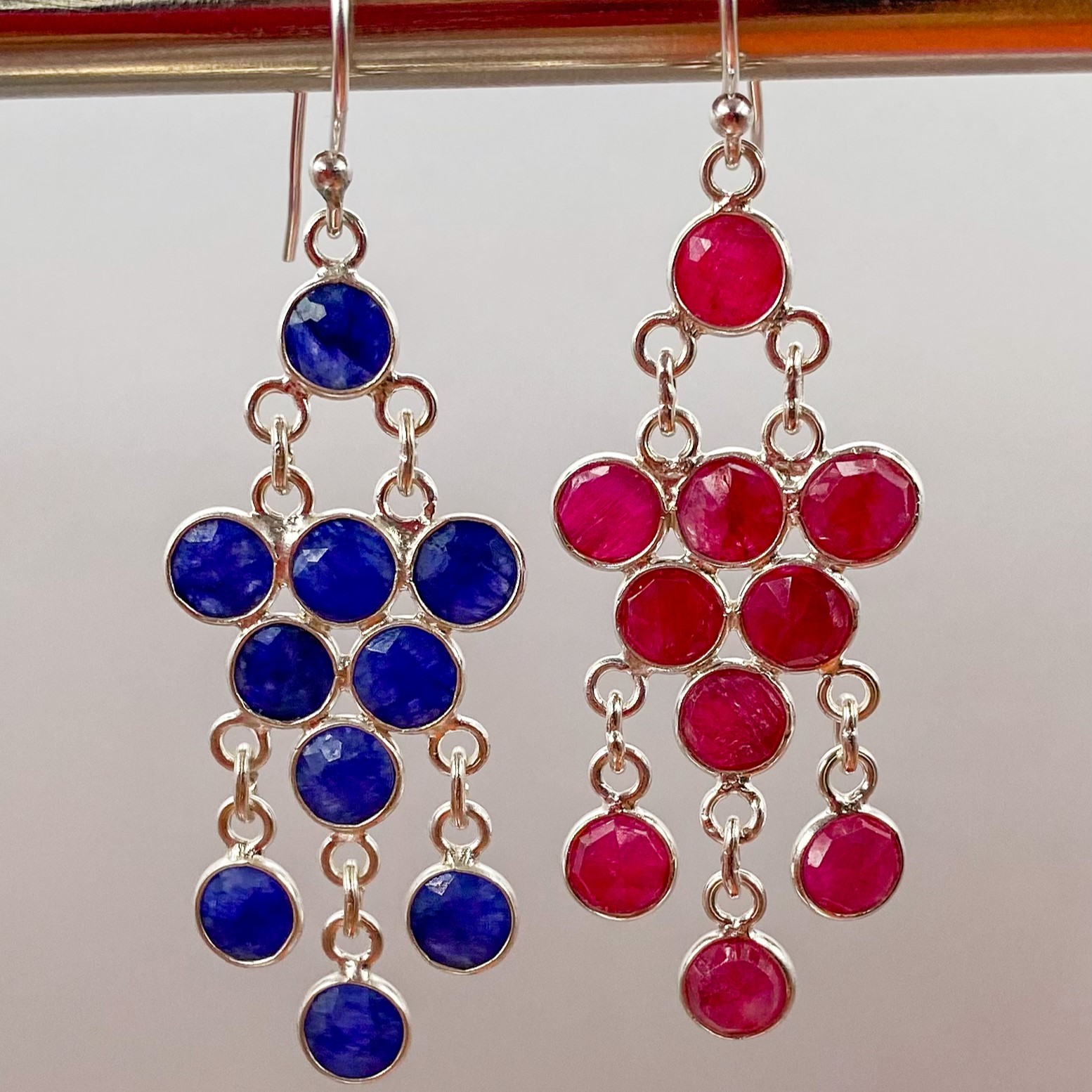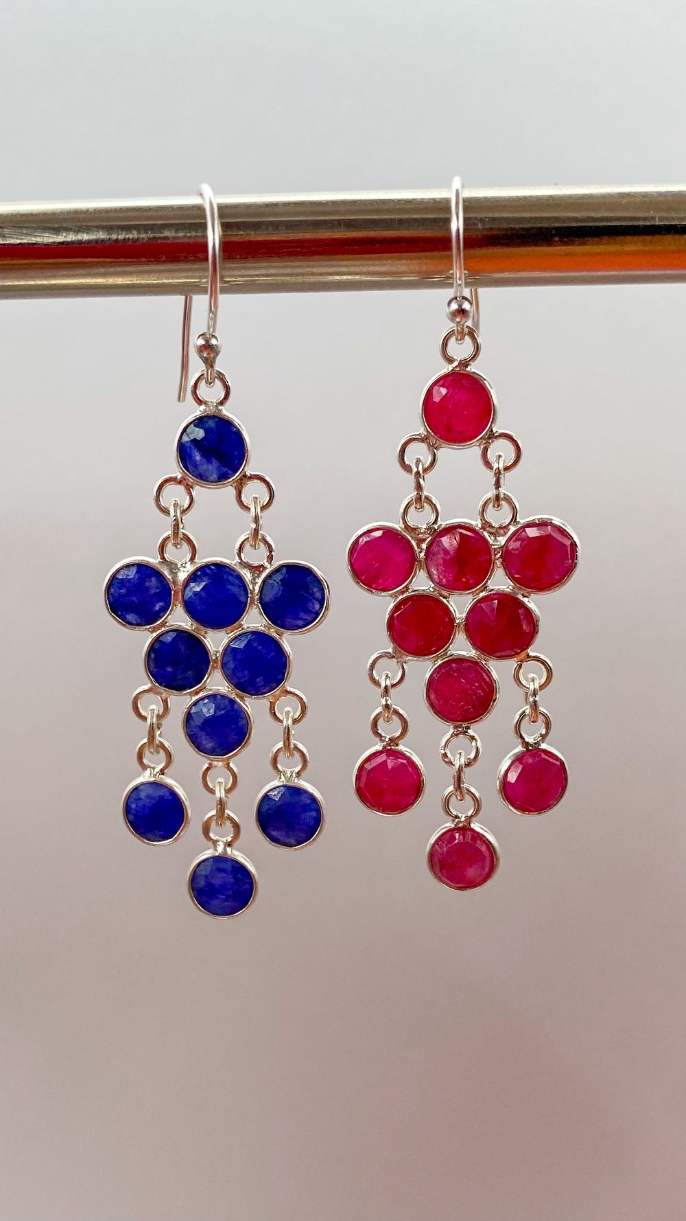 Au centre de ces boucles d’oreilles pendantes se trouve des pierres naturelles – gemmes. Vous avez le choix entre le rouge vibrant du rubis ou le bleu profond de la calcédoine.