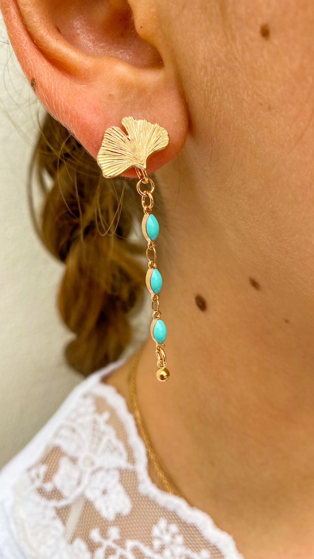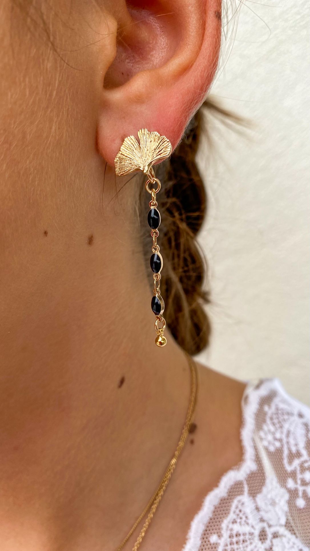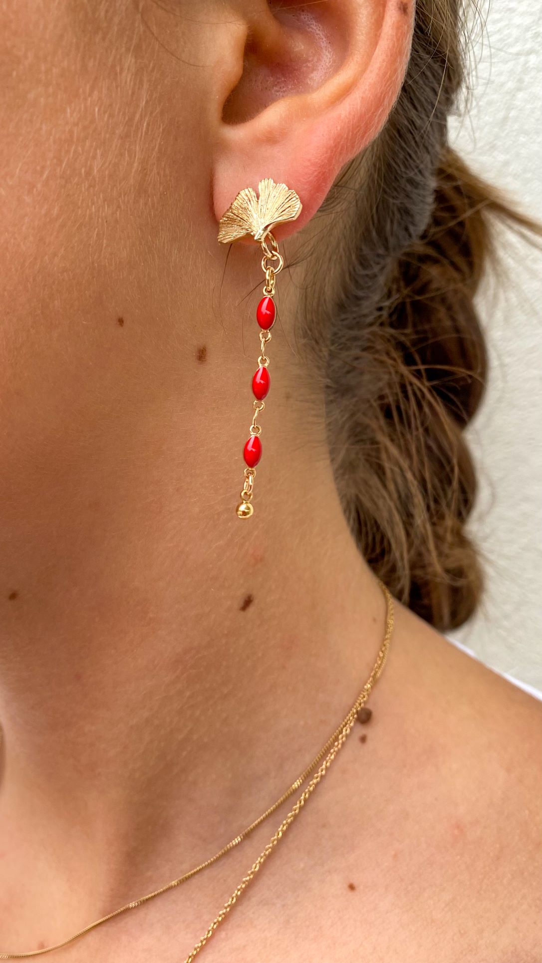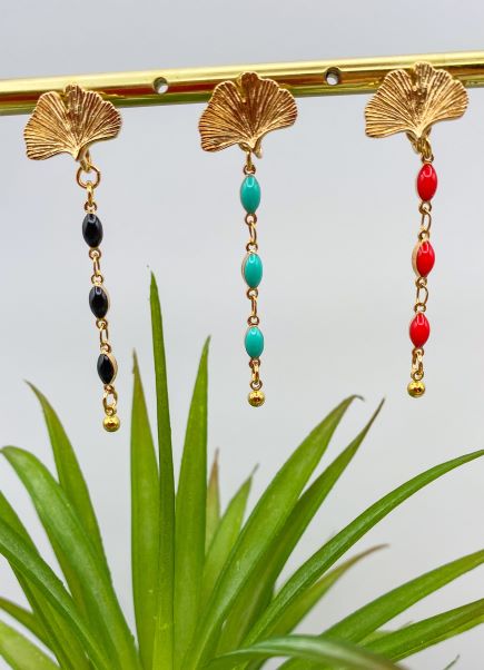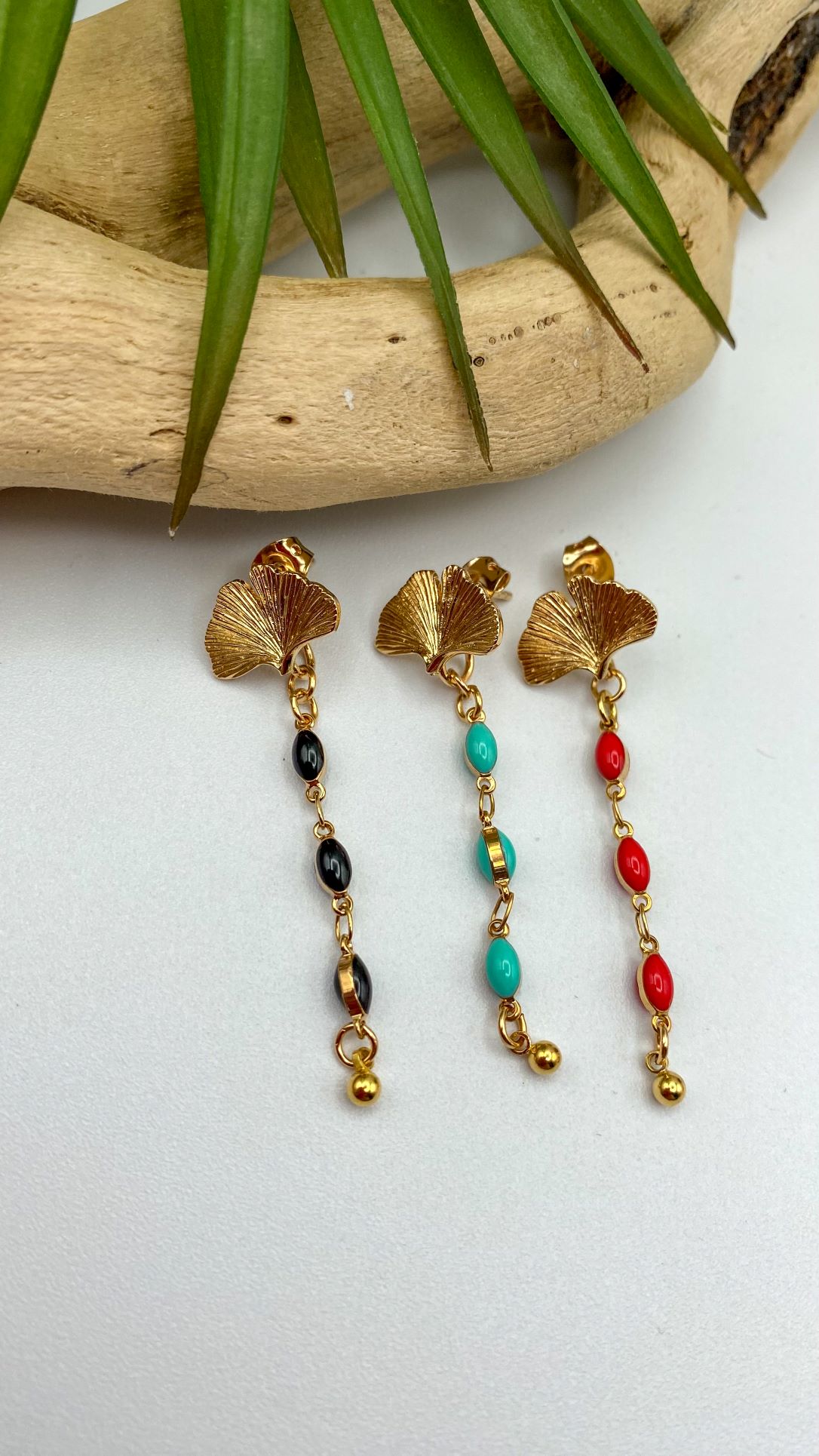 Ces boucles pendantes sont formées d’un splendie ginkgo en plaqué or très finement travaillé à partir duquel pend une chaine en plaquée or parsemés de boule en résine de forme ovale : rouge, noir ou bleu turquoise.