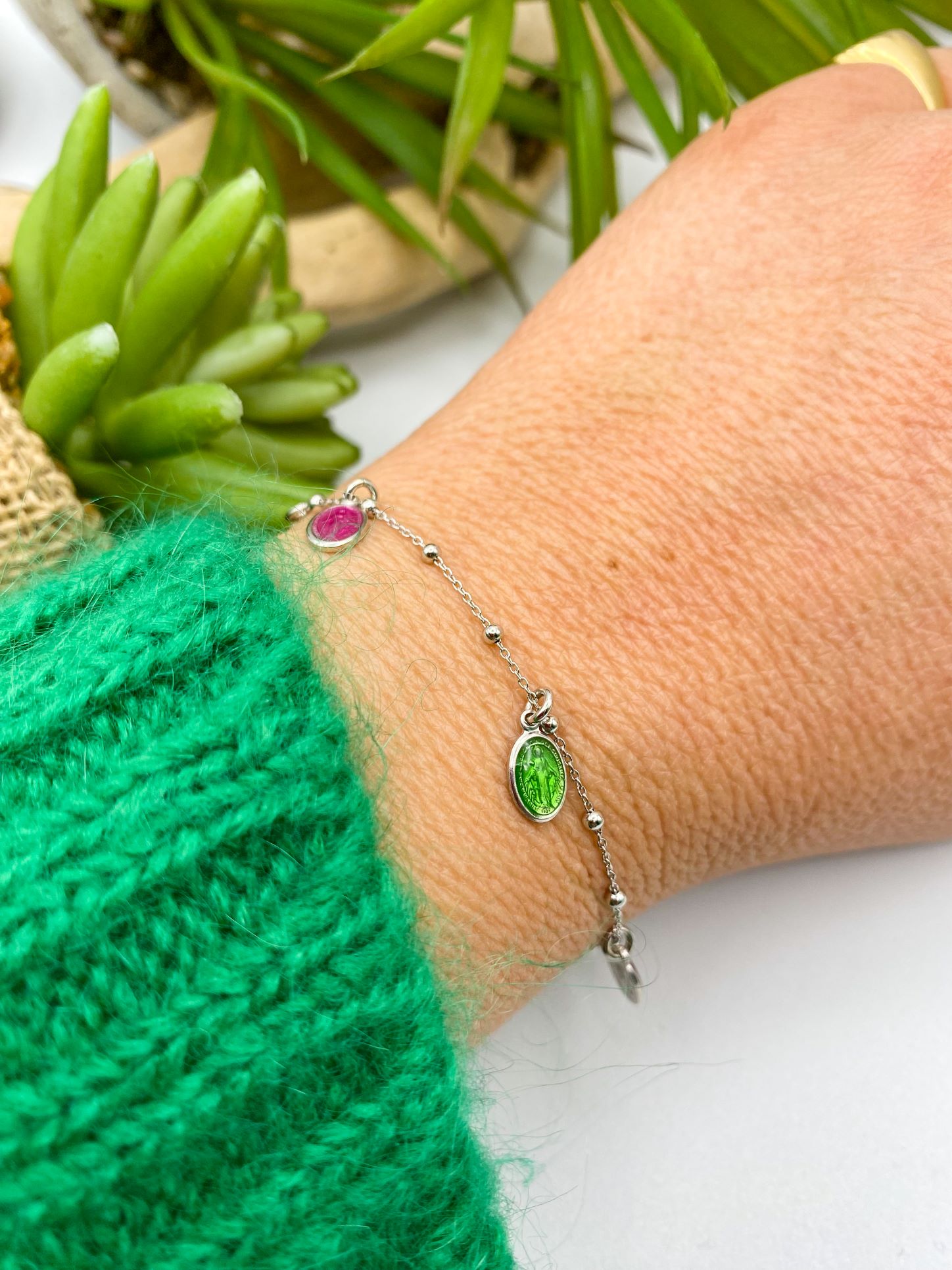 Ce bracelet a un modèle de médailles miraculeuses originales: des médailles miraculeuses de toutes les couleurs pour une foi haute en couleur ! Un bijou catho « branchée » de par ses lignes pures et ses couleurs vives. Ce bracelet médaille miraculeuse en argent est un cadeau catho au goût du jour qui pourra être porté par toutes de la jeune fille à la femme plus âgée. Ce bracelet est un réel petit bijou, grâce à la finesse de ses pendentifs religieux. Les bracelets médailles miraculeuses colorées de Gemmes et Vous sont conçus pour vous offrir une touche personnelle unique et vous permettre de vous démarquer.