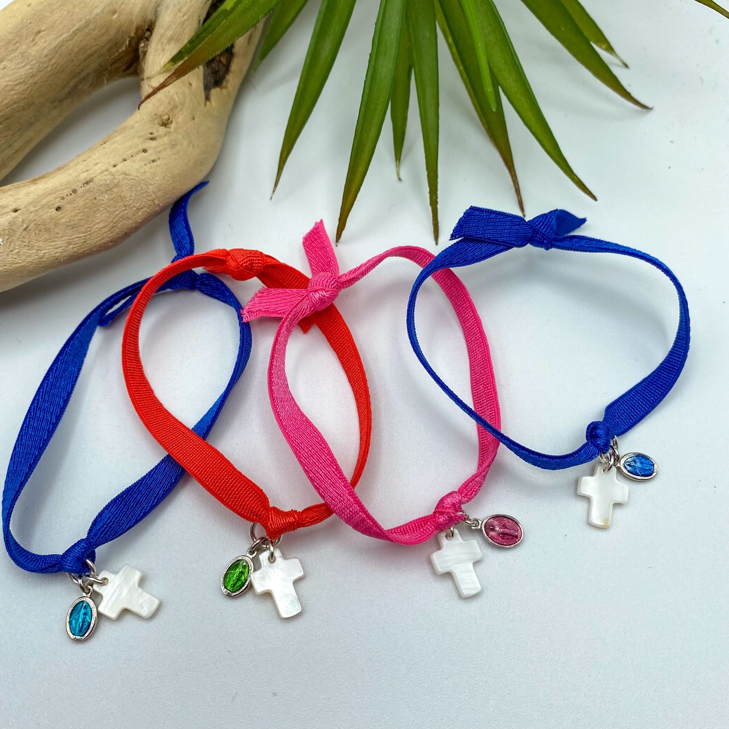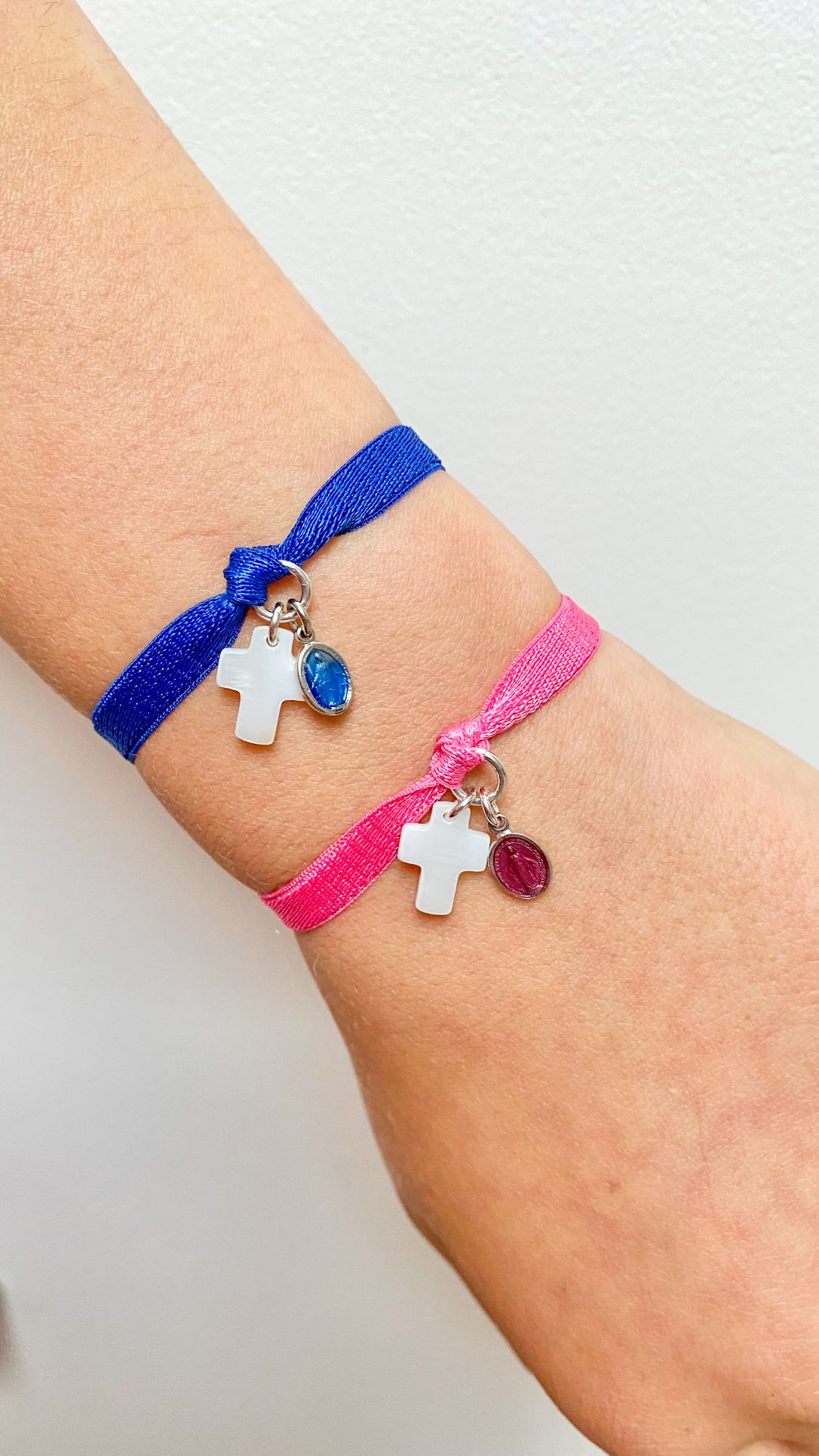 Couleur du bracelet | Elastique bleu et sa médaille miraculeuse turquoise et croix en nacre, Elastique rouge et sa médaille miraculeuse verte et croix en nacre, Elastique bleu et sa médaille miraculeuse bleue et croix en nacre, Elastique rose et sa médaille miraculeuse rose et croix en nacre |