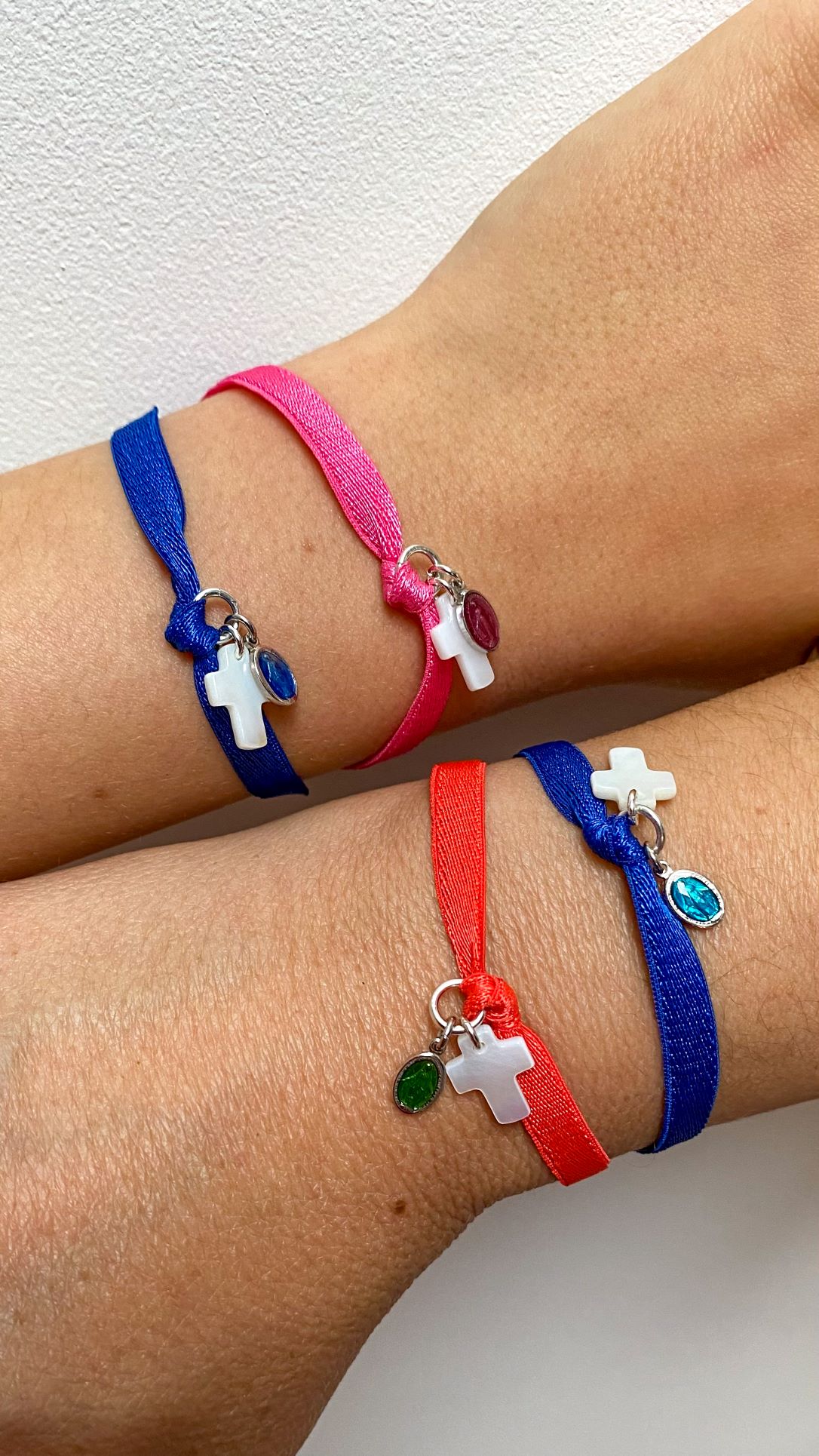 A vous de personnaliser votre bijou religieux en choisissant la couleur de l’élastique: bleu marine, rose ou rouge. Vous choisirez également selon le modèle de votre bijou catho, la couleur de la médaille miraculeuse en argent qui est émaillée en vert, rose, bleu et bleu turquoise.
