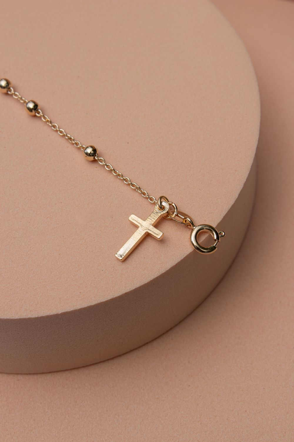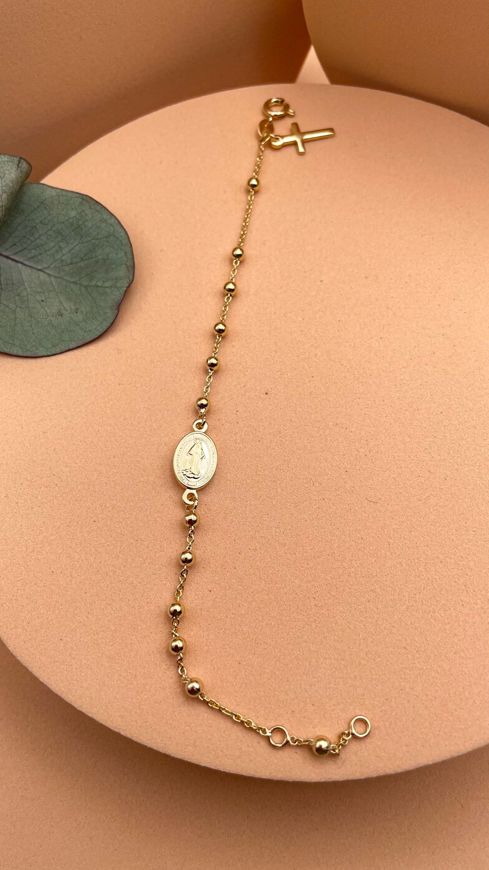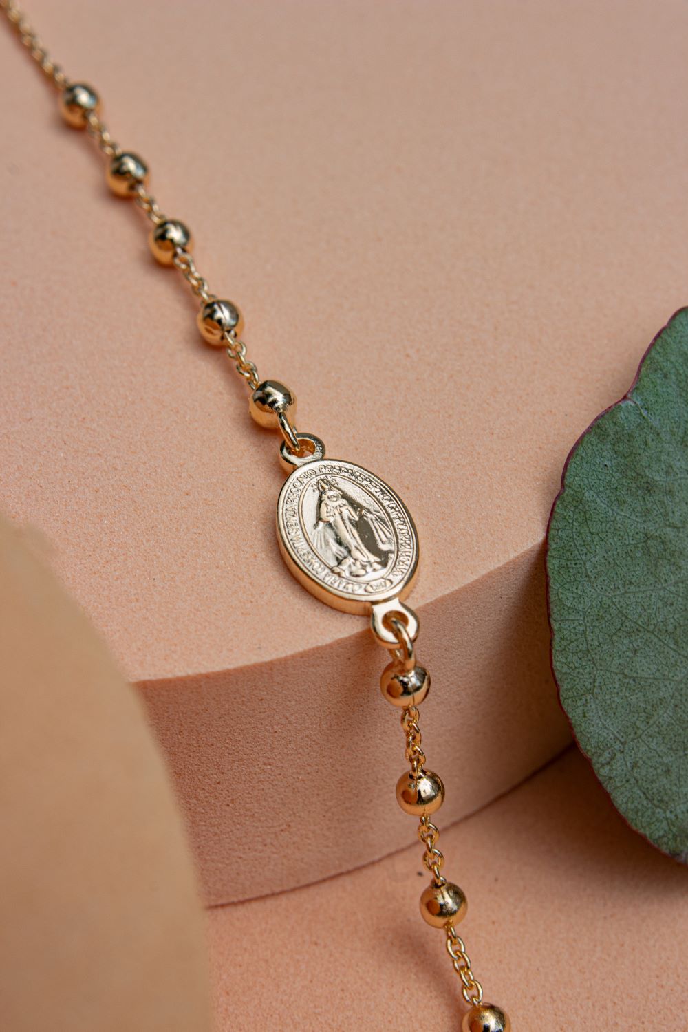 Ce bracelet est délicatement ornée de perles, d’une médaille de la Vierge miraculeuse ainsi que d’une croix plate le tout en plaqué or.