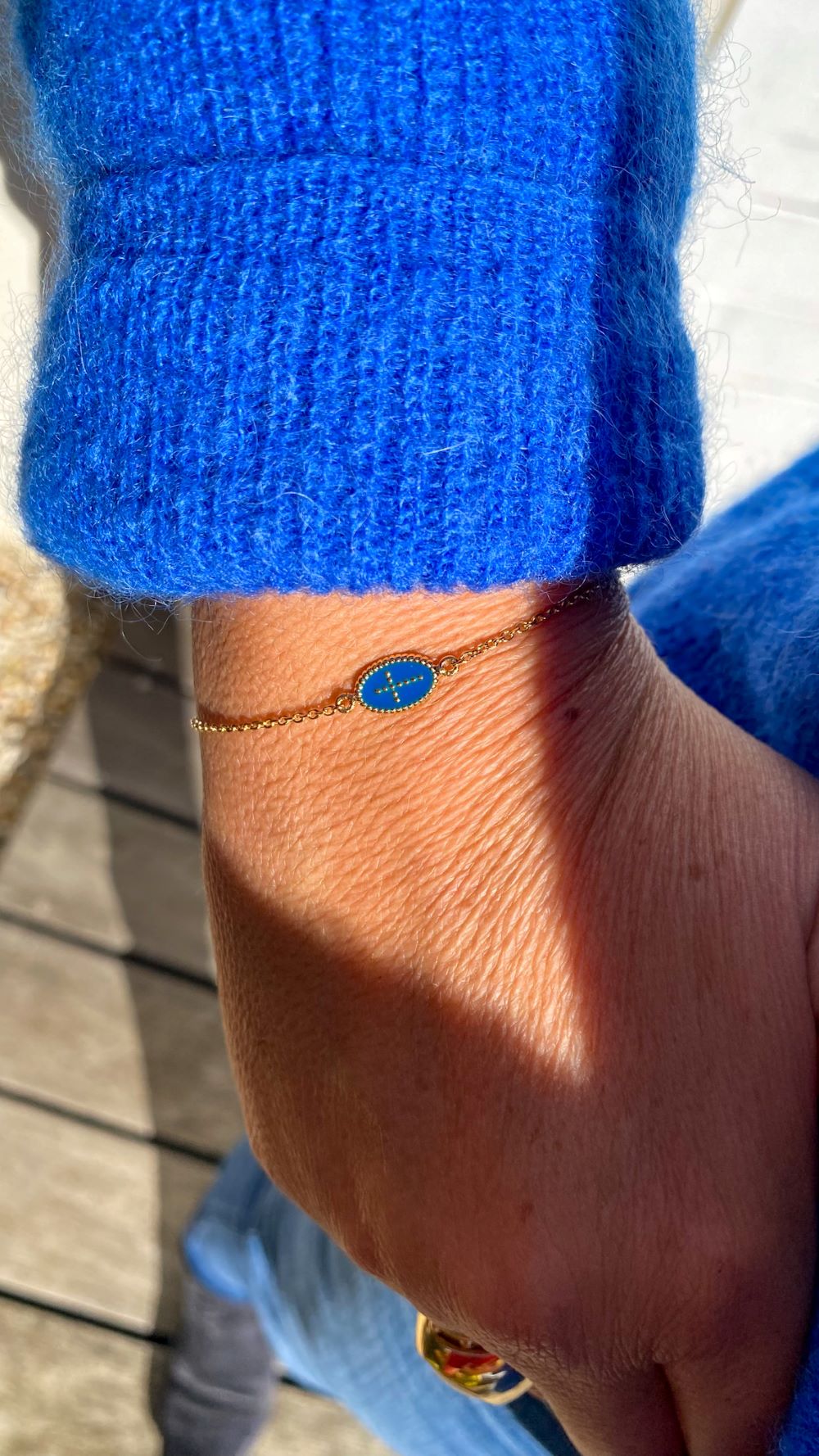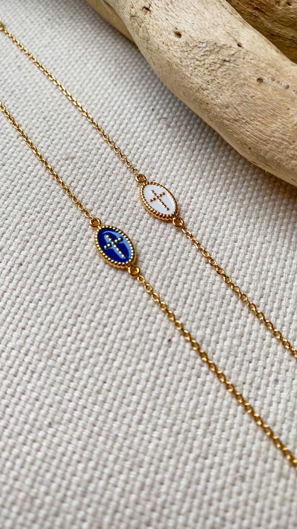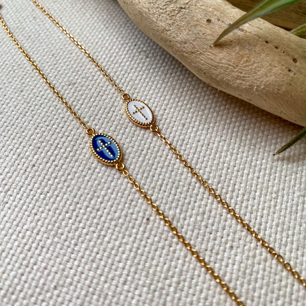 Bracelet catho sur chaine en plaqué or orné d’une médaille de forme ovale. Ce pendentif religieux est très original de part sa forme ovale mais aussi de part son contour qui est perlé. C’est une médaille religieuse très fine et élégante. Cette médaille perlée est remplie d’ émail coloré aux couleurs très douces. A vous de choisir et de personnaliser votre bijou religieux en optant pour de l’émail blanc ou bleu marine.