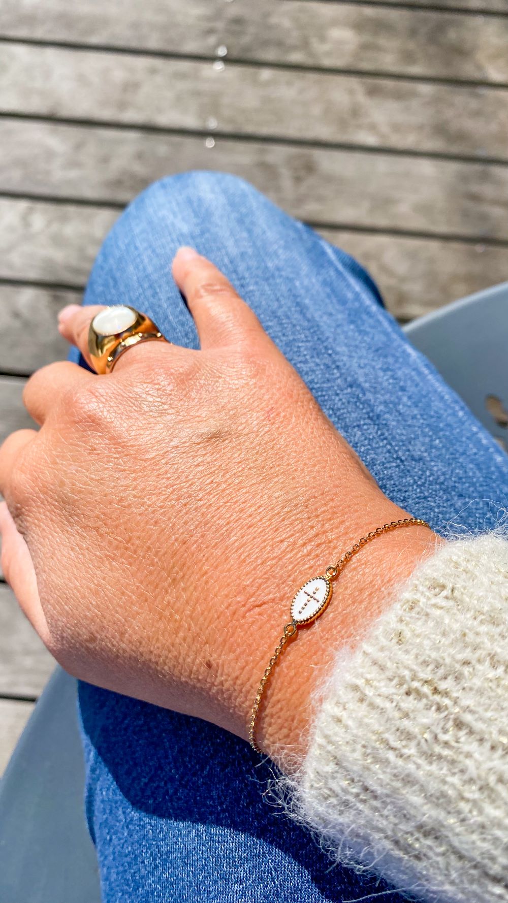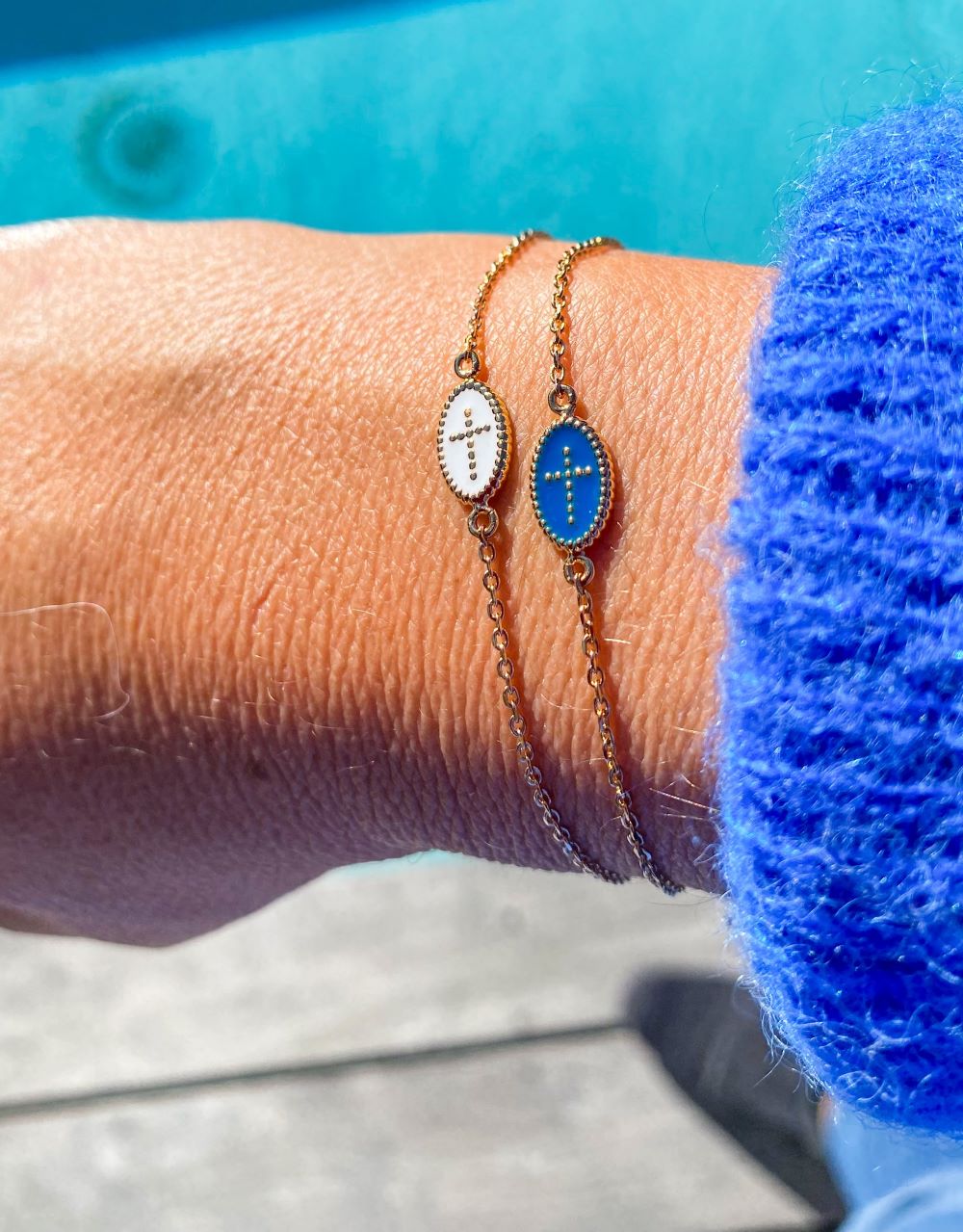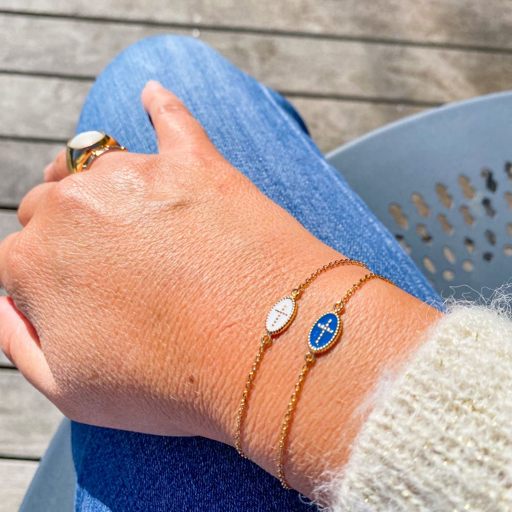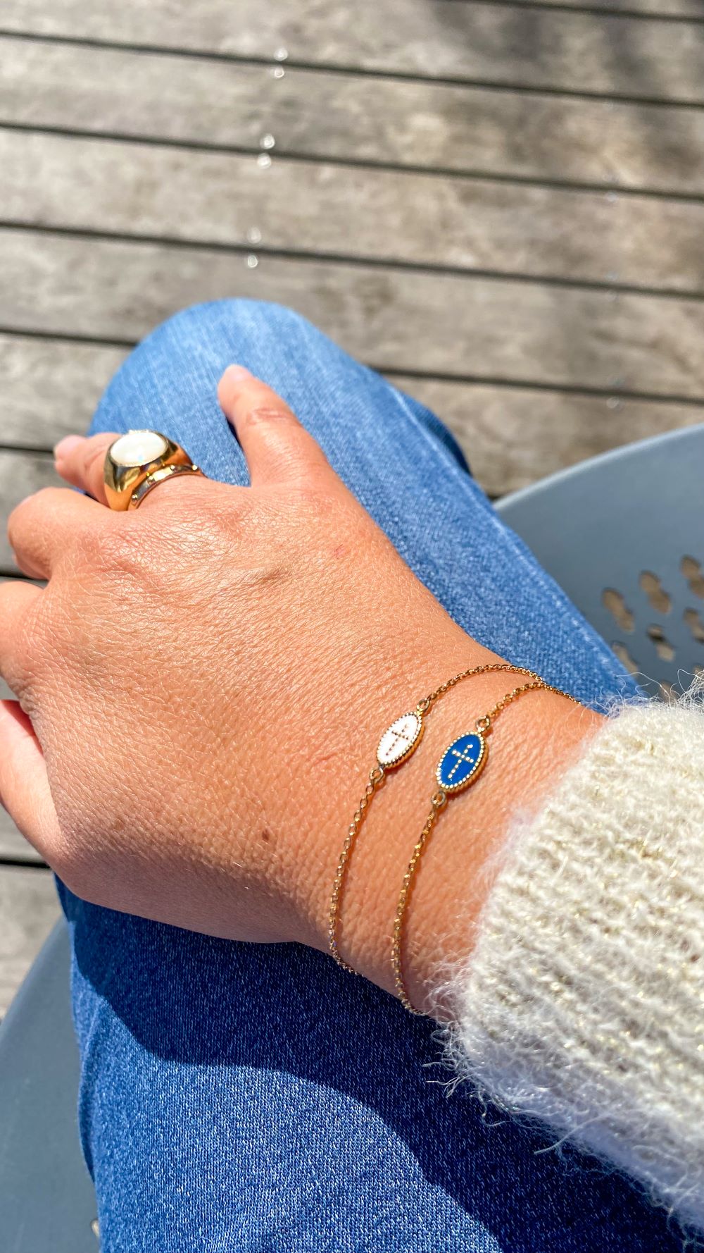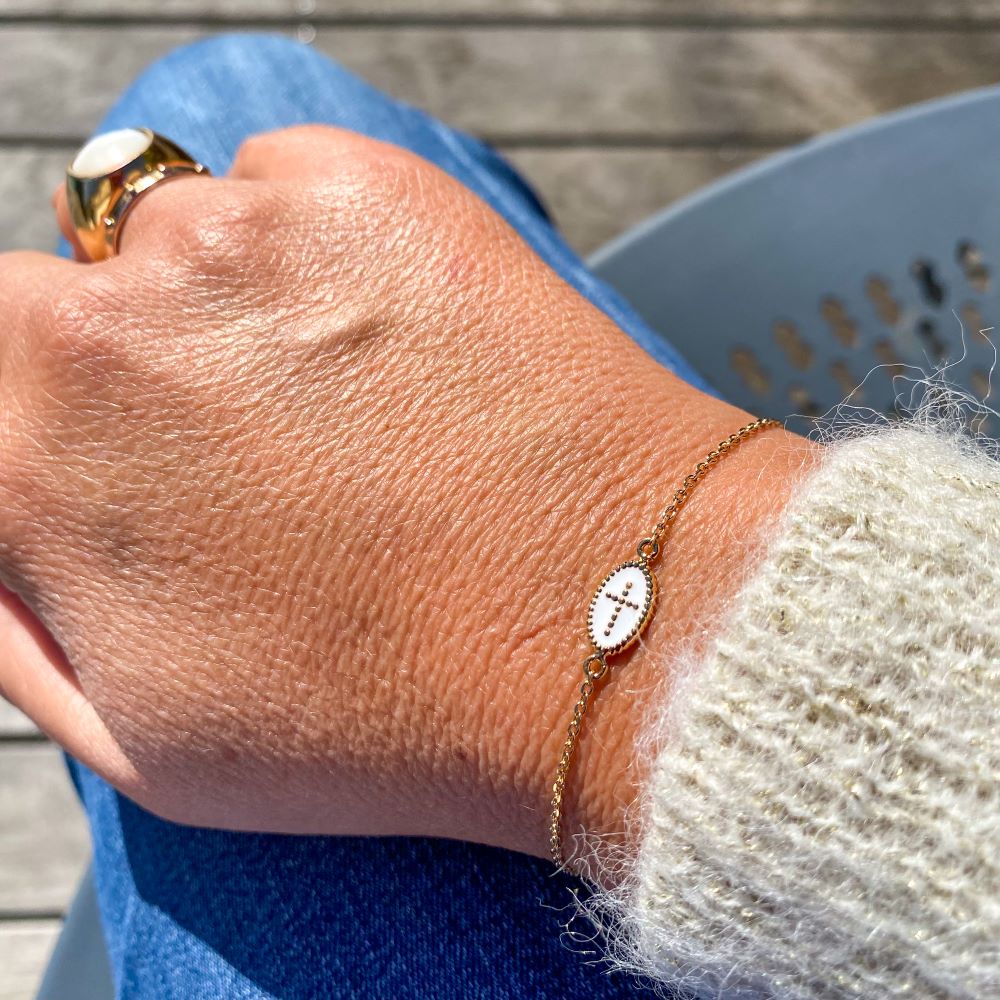 Bracelet médaillon croix perlée sur fond émaillé en plaqué or | Christi