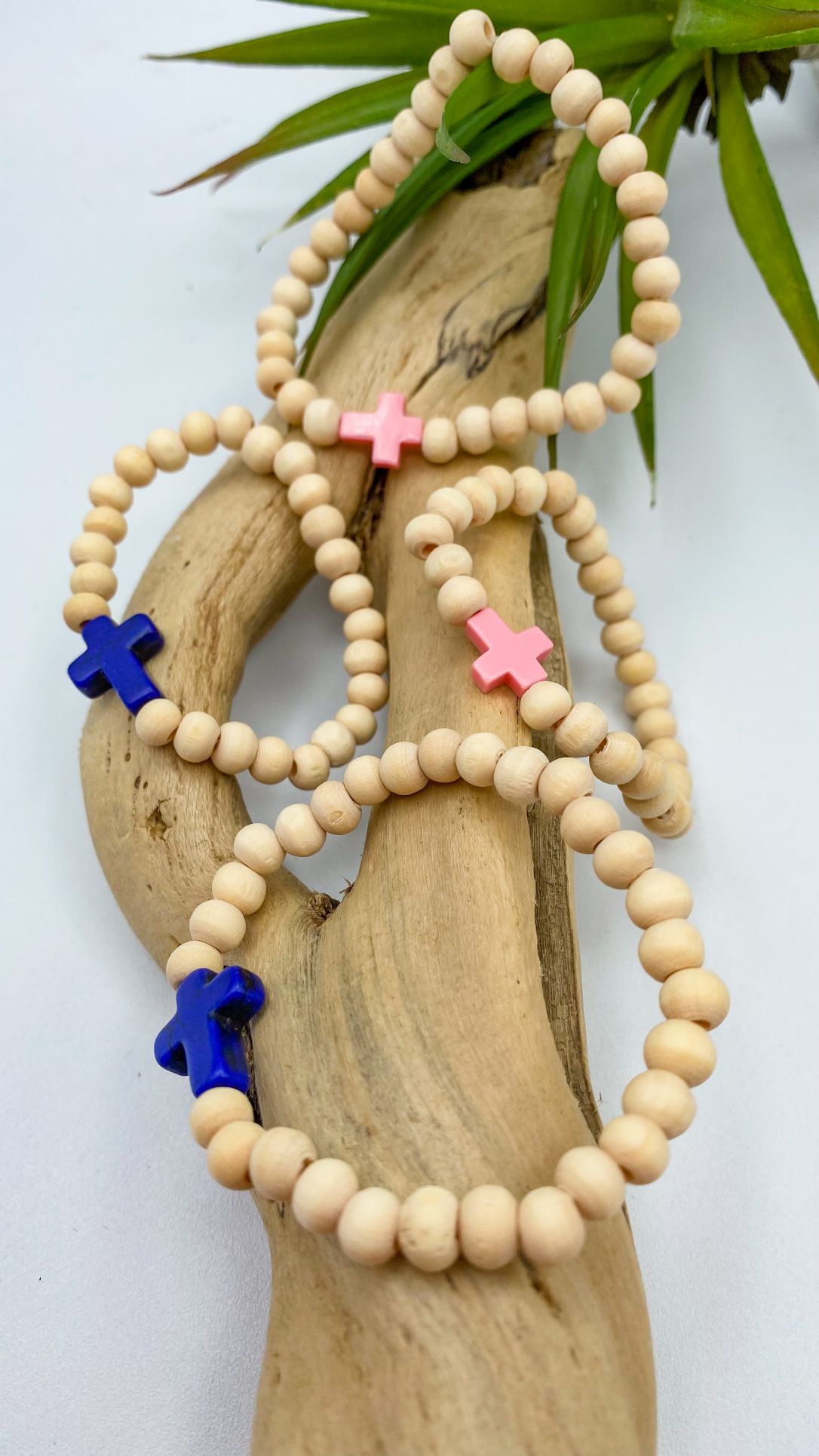 Bracelet de perles en bois avec croix en pierre colorée. Monté sur sur élastique résistant.