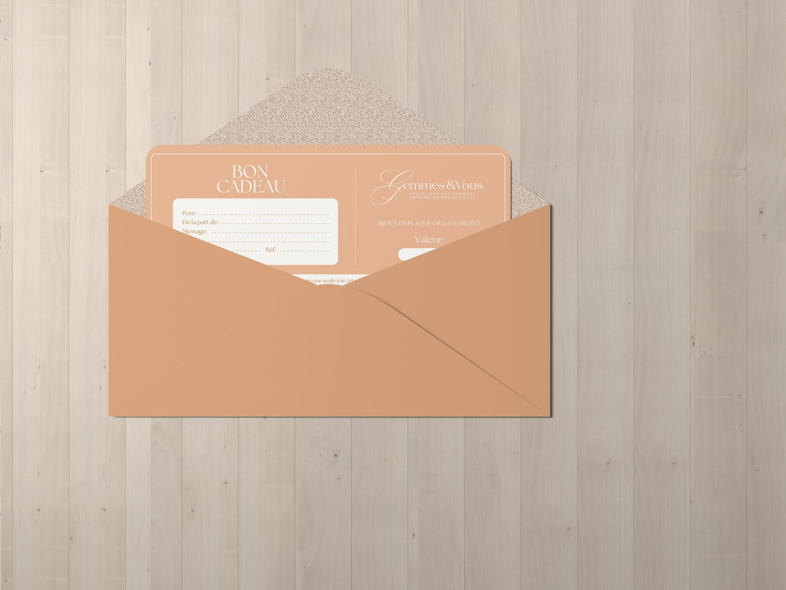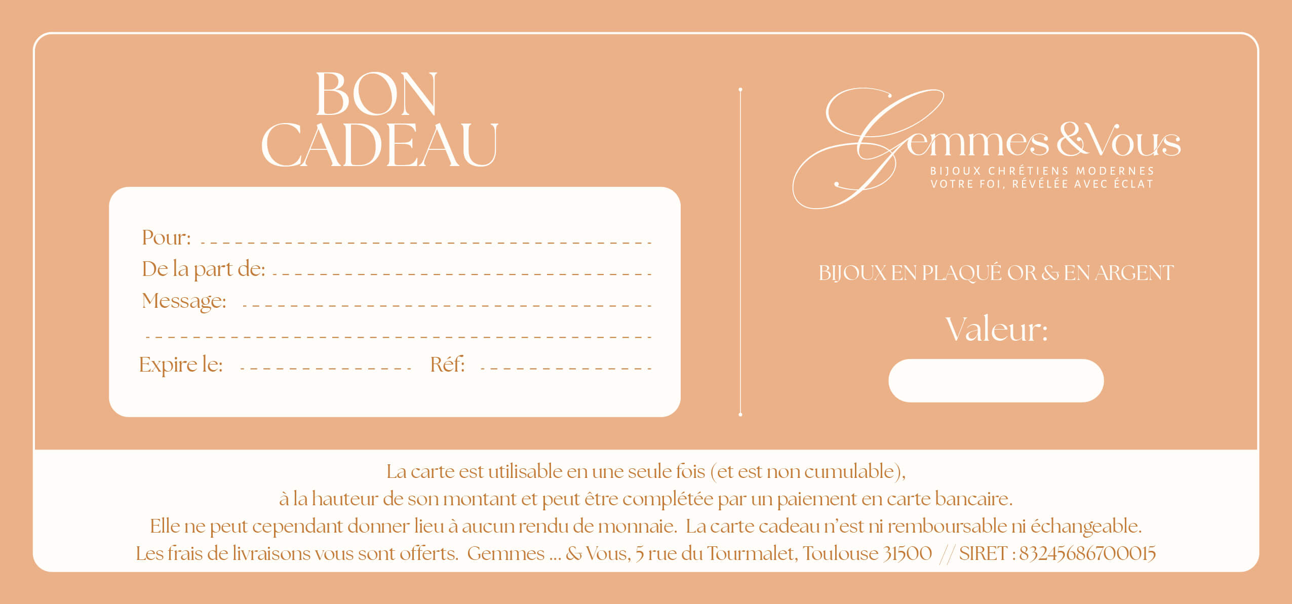 La carte cadeau Gemmes…& Vous existe en 5 montants : 25 euros , 50 euros, 75 euros , 100 euros et 150 euros.