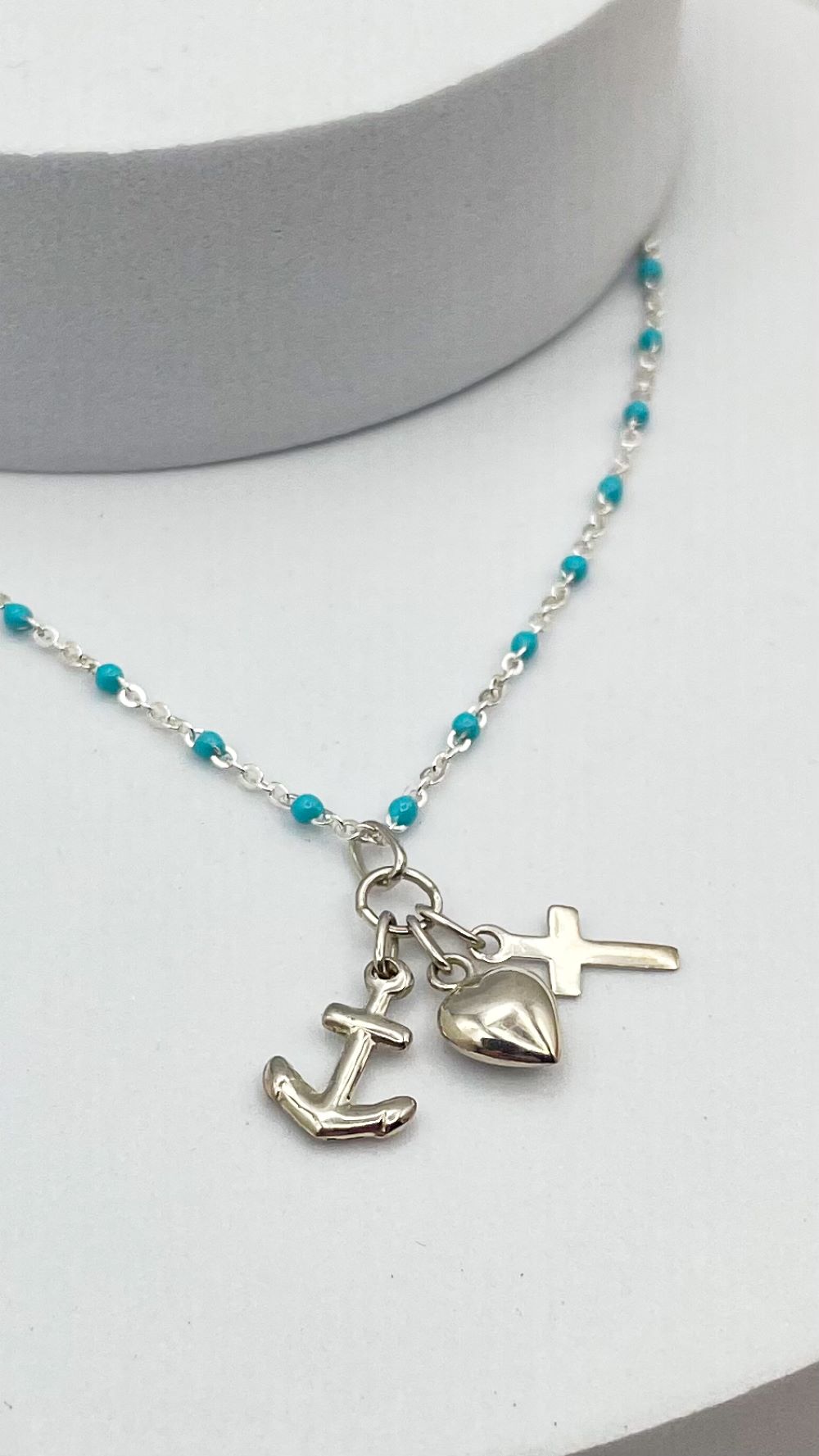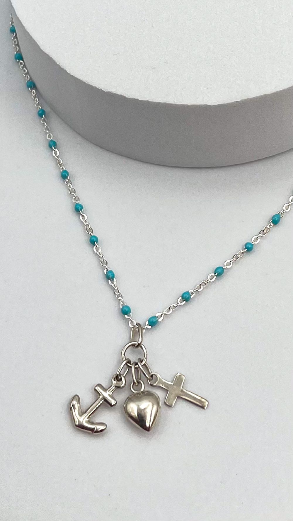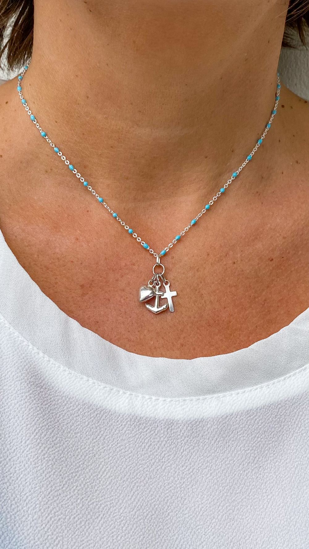 Ce nouveau bijou religieux de chez Gemmes … & Vous est riche en symbole. Ce collier religieux raffiné en argent est composé d’une chaîne en argent ornée de perles en résine bleue turquoise. Au centre de ce bijou catho se trouve un pendentif religieux composé de trois breloques en argent : une ancre, une croix et un cœur.