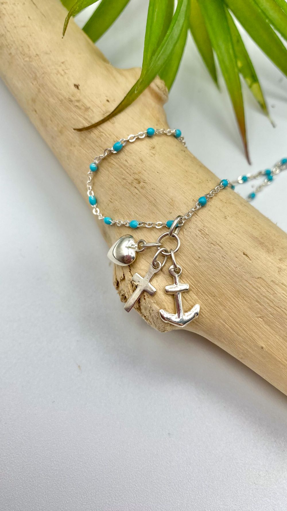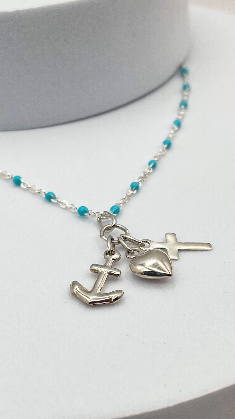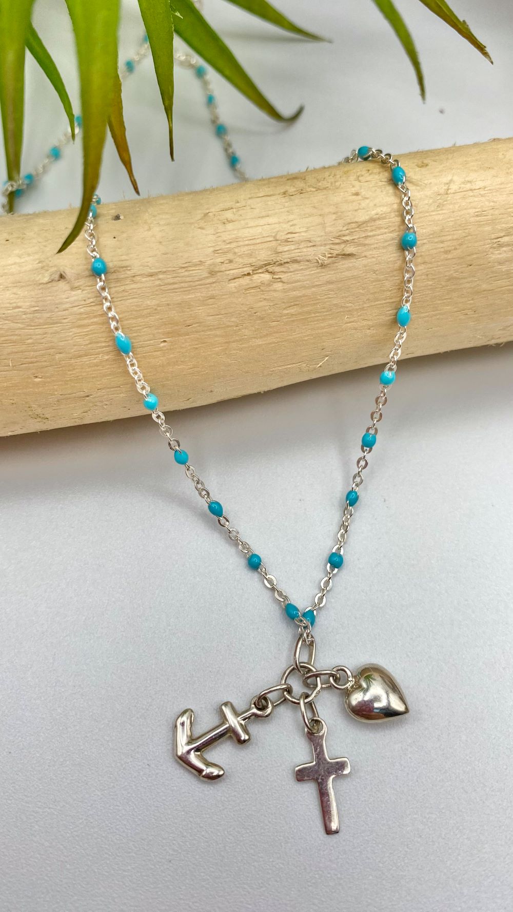 Ce nouveau bijou religieux de chez Gemmes … & Vous est riche en symbole. Ce collier religieux raffiné en argent est composé d’une chaîne en argent ornée de perles en résine bleue turquoise. Au centre de ce bijou catho se trouve un pendentif religieux composé de trois breloques en argent : une ancre, une croix et un cœur.