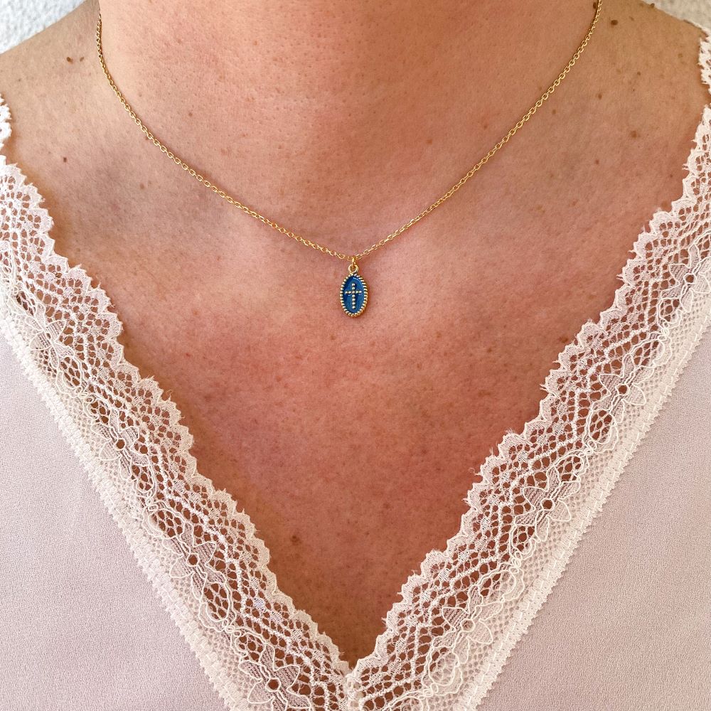 Collier catho sur chaine en plaqué or orné d’une médaille de forme ovale. Ce pendentif religieux est très original de part sa forme ovale mais aussi de part son contour qui est perlé. C’est une médaille religieuse très fine et élégante. Cette médaille perlée est remplie d’ émail coloré aux couleurs très douces. A vous de choisir et de personnaliser votre bijou religieux en optant pour de l’émail blanc, bleu marine ou turquoise.