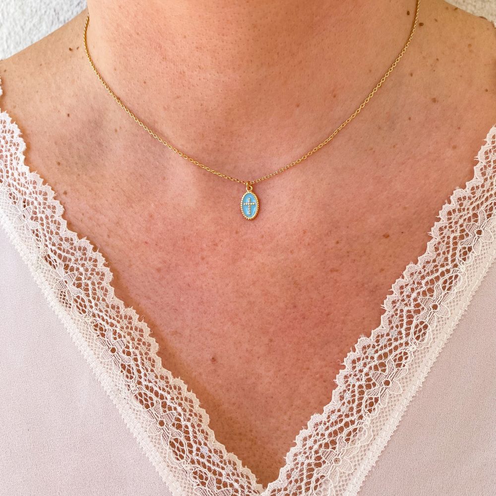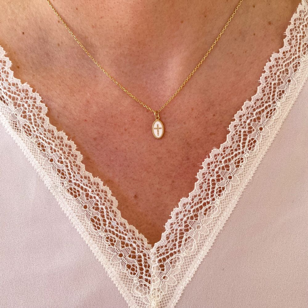 Collier avec médaille ovale perlée croix émail coloré en plaqué or | Christi