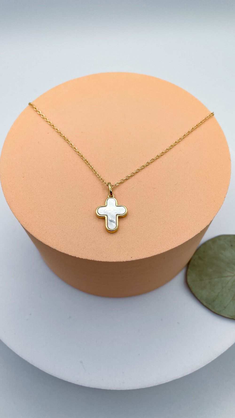 Collier religieux en Plaqué Or composé d’une splendide croix en nacre véritable sertie en plaqué or. Ce pendentif religieux en forme de croix est monté sur une chaine en plaqué or.