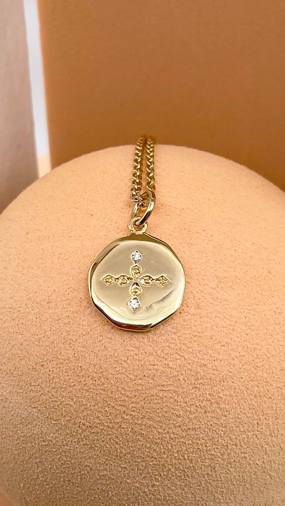 Ce collier en Plaqué Or est composé d’une médaille en plaqué or, au centre de cette médaille se trouve une très belle croix ornée de strass aux deux extrémités de la barre verticale de la croix. Ce pendentif religieux est fixé sur une chaîne aux maillons très délicats: chaîne en plaqué or alternant une maille lisse et une maille légèrement et très délicatement striée. Cette originalité de cette chaîne en fit un bijou catho unique et très contemporain. Votre bijou religieux: un bijou religieux moderne et revisité !