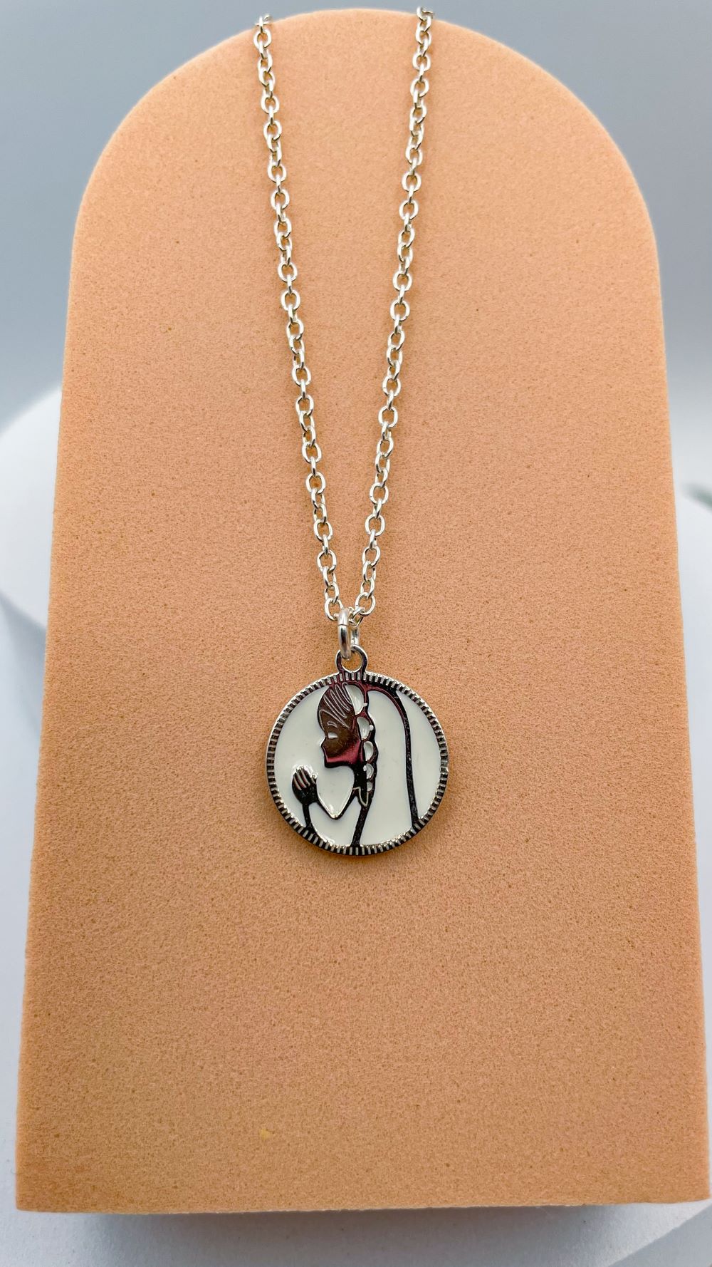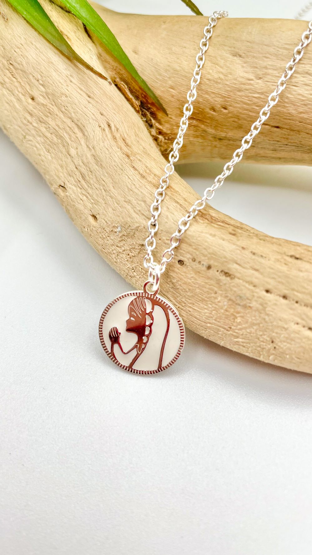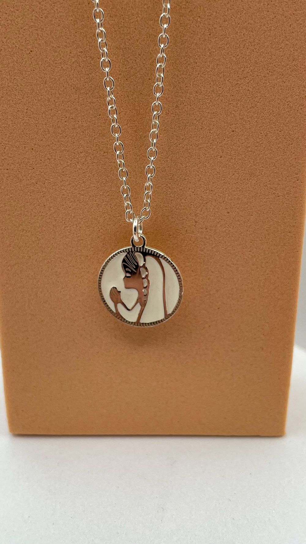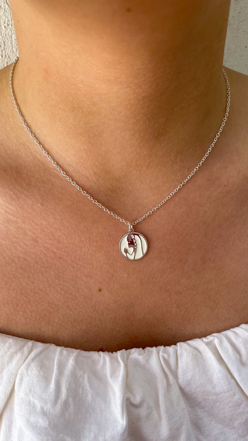 Ce qui distingue ce collier, c’est son art méticuleux. La médaille de la Vierge Marie présente un contraste saisissant entre les détails en argent du visage et des mains de la Vierge et le fond émaillé de blanc. Cette combinaison unique crée une esthétique captivante qui attire le regard.