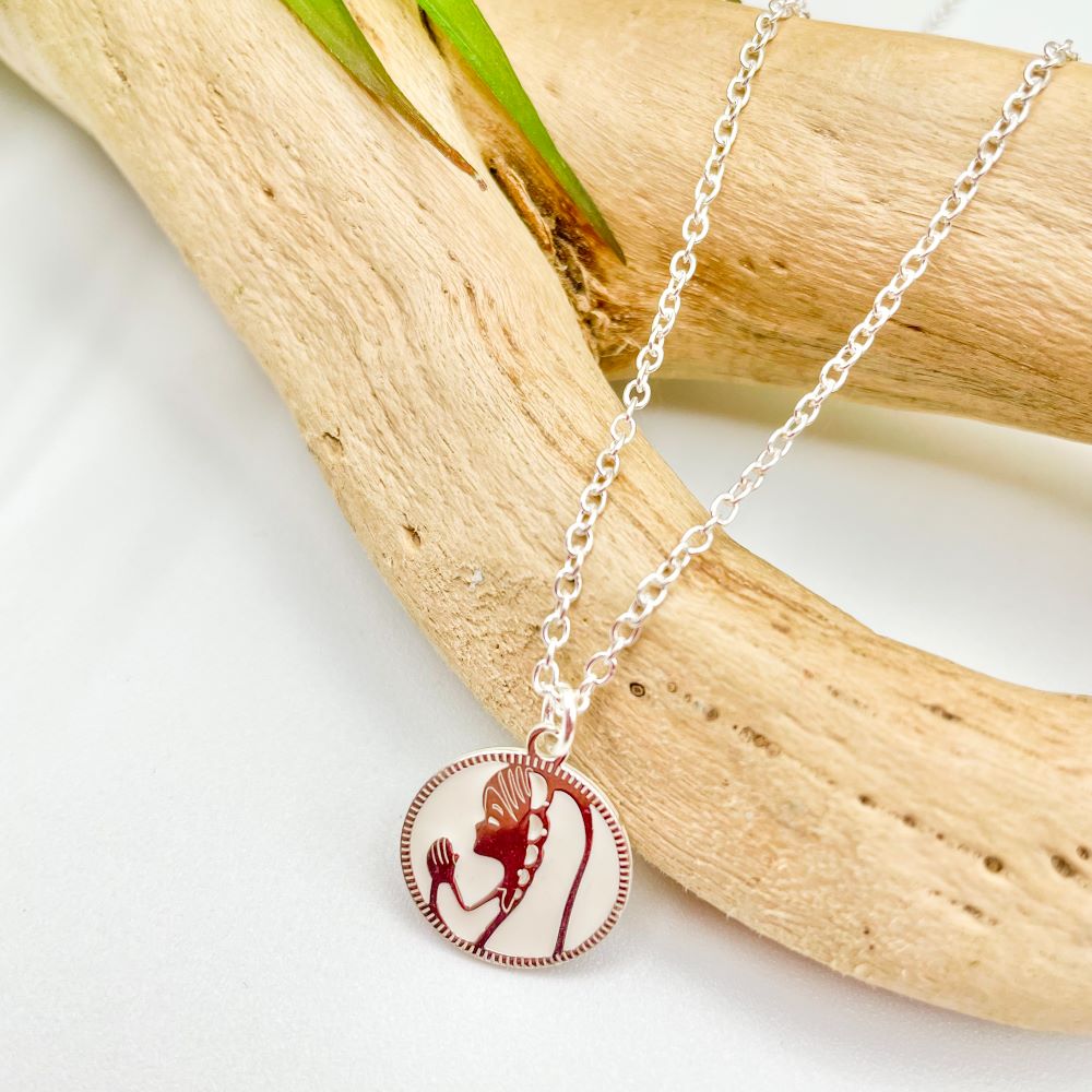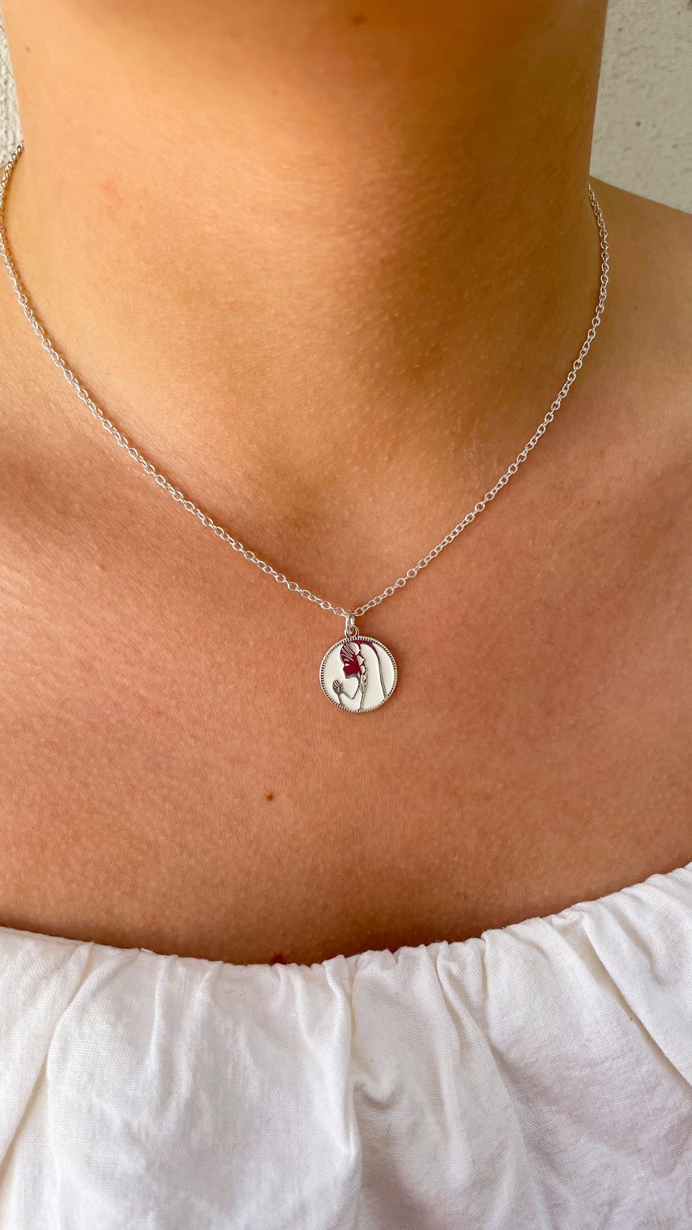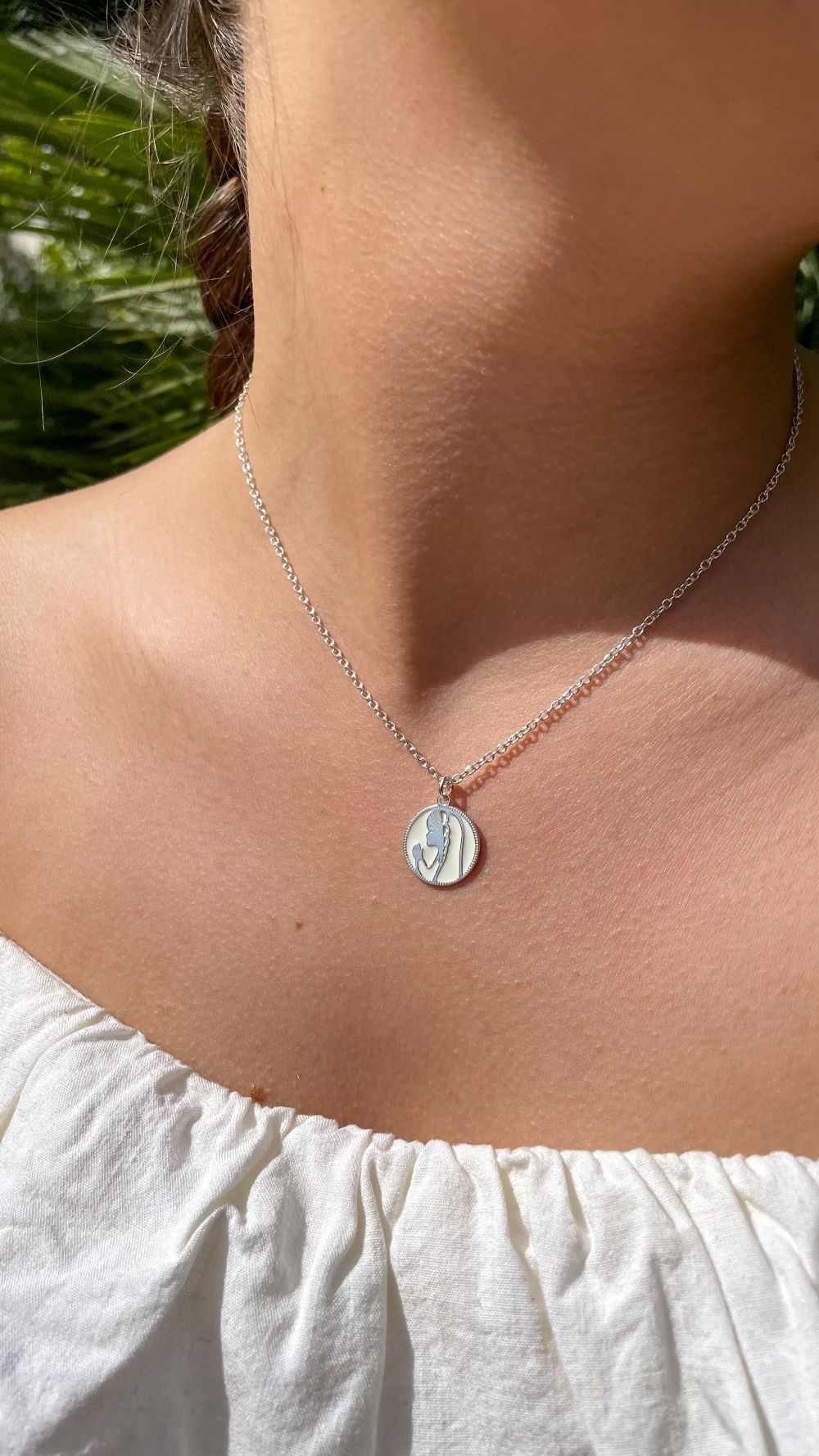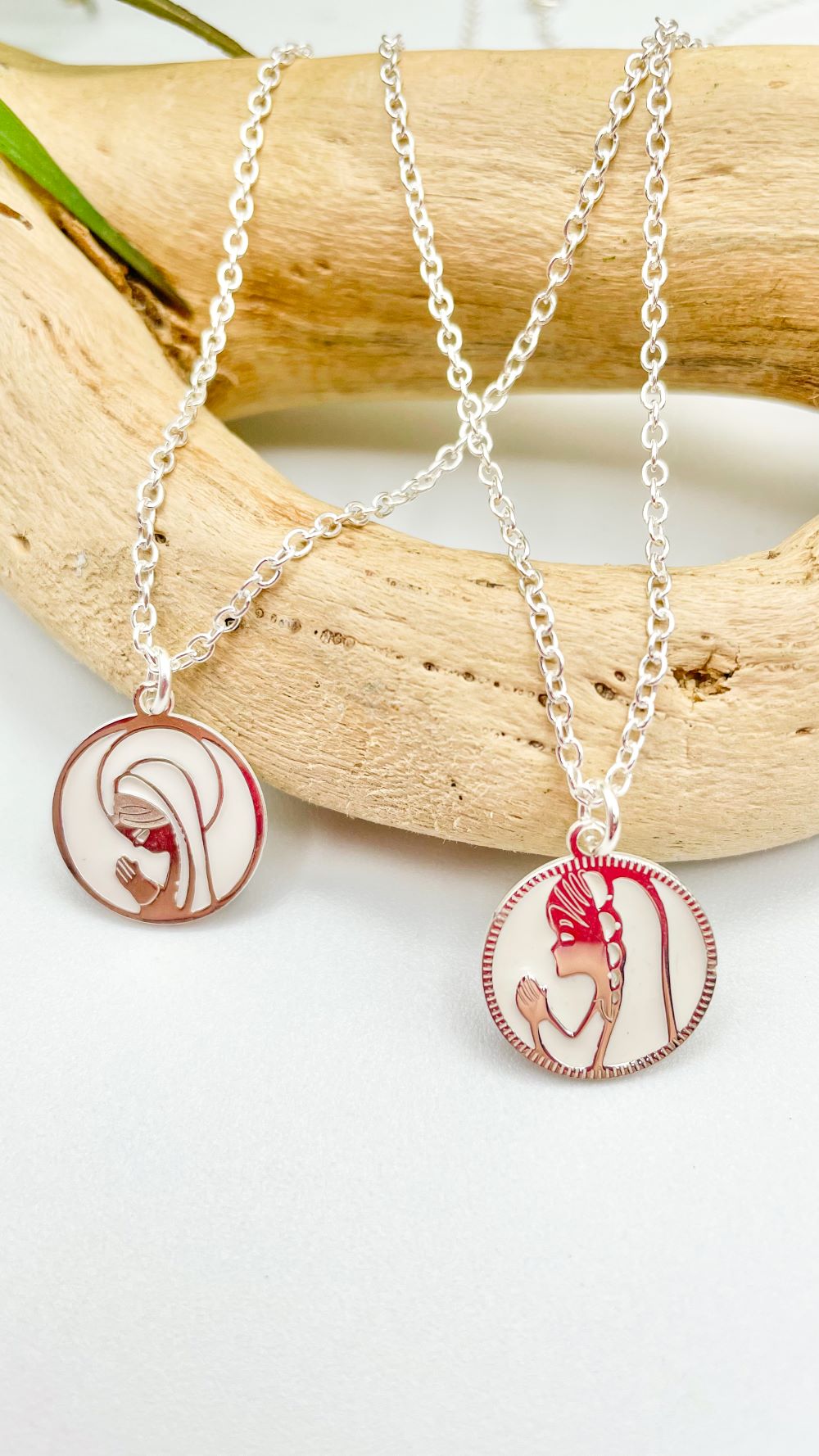 Ce qui distingue ce collier, c’est son art méticuleux. La médaille de la Vierge Marie présente un contraste saisissant entre les détails en argent du visage et des mains de la Vierge et le fond émaillé de blanc. Cette combinaison unique crée une esthétique captivante qui attire le regard.
