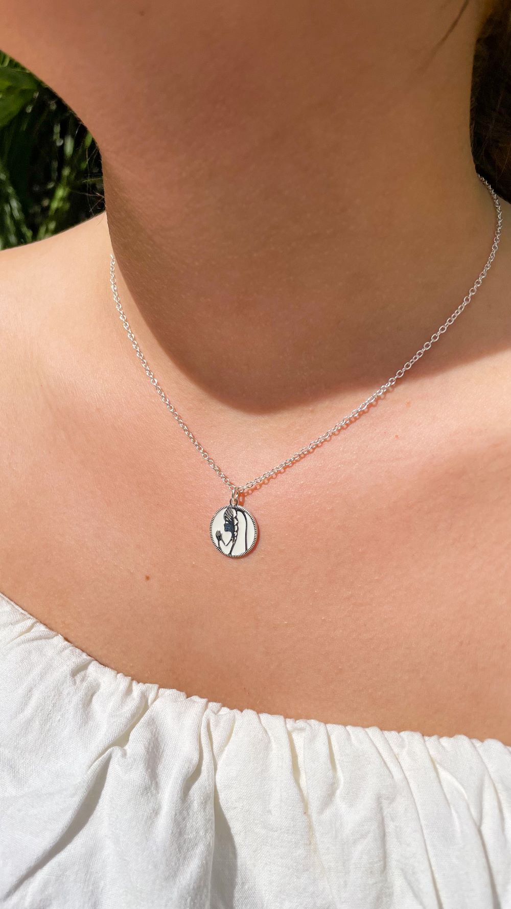 Le choix du mariage de l’argent avec l’émail blanc fait de ce bijoux religieux un vrai collier catho revu et visité au goût du jour.