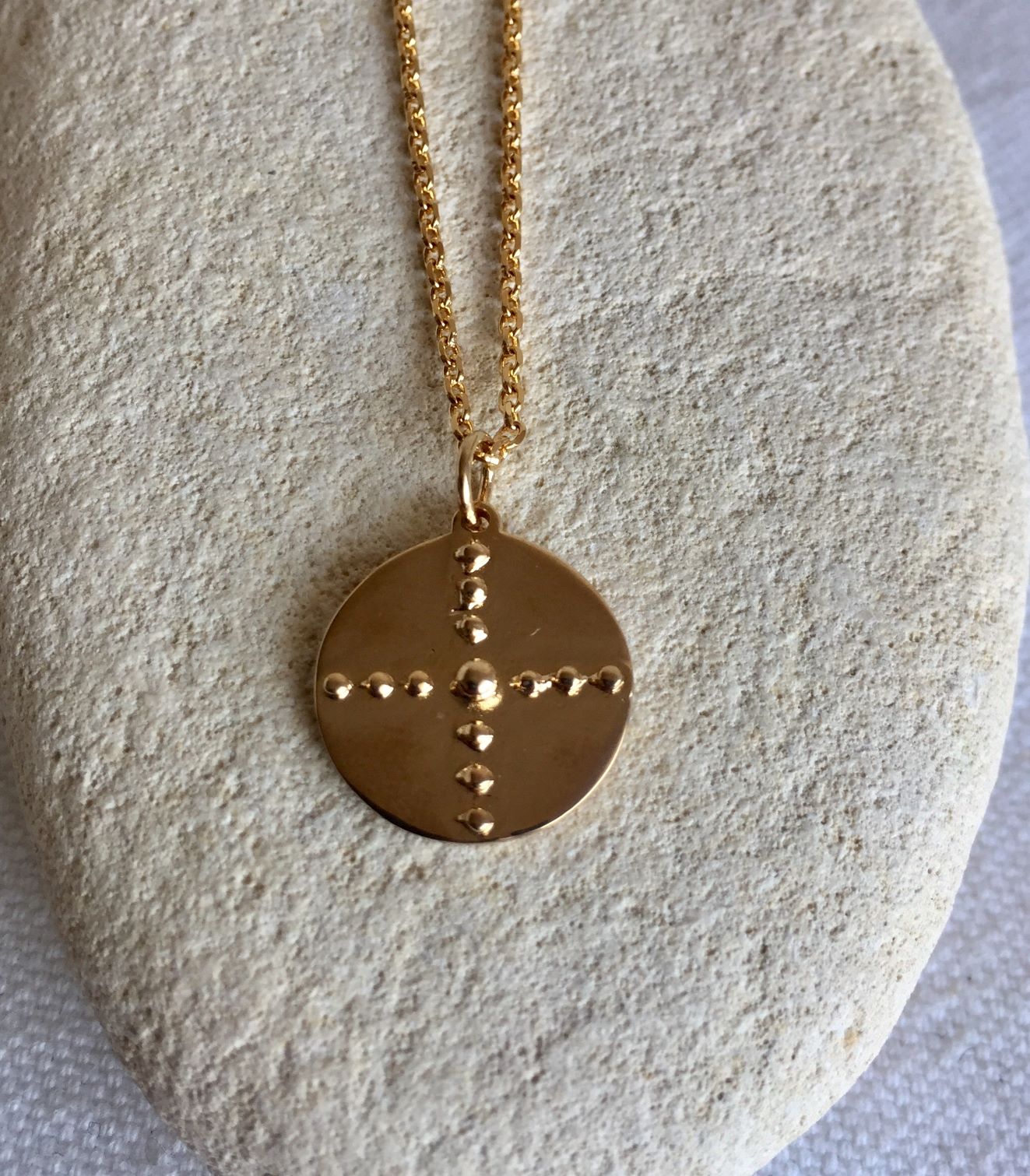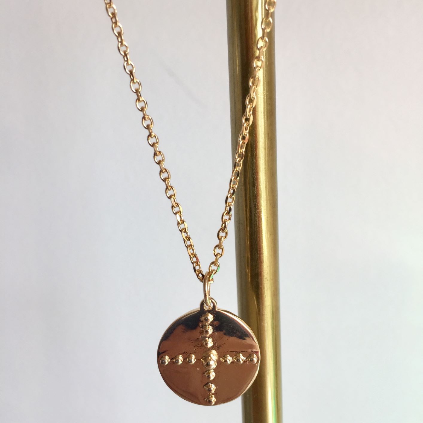 Coup de coeur assuré pour ce collier catho original « revu et corrigé » ! Collier en Plaqué Or composé d’une maille forçat orné d’une médaille très originale. La médaille lisse est ornée en son centre de petits points mis en relief formant une croix.