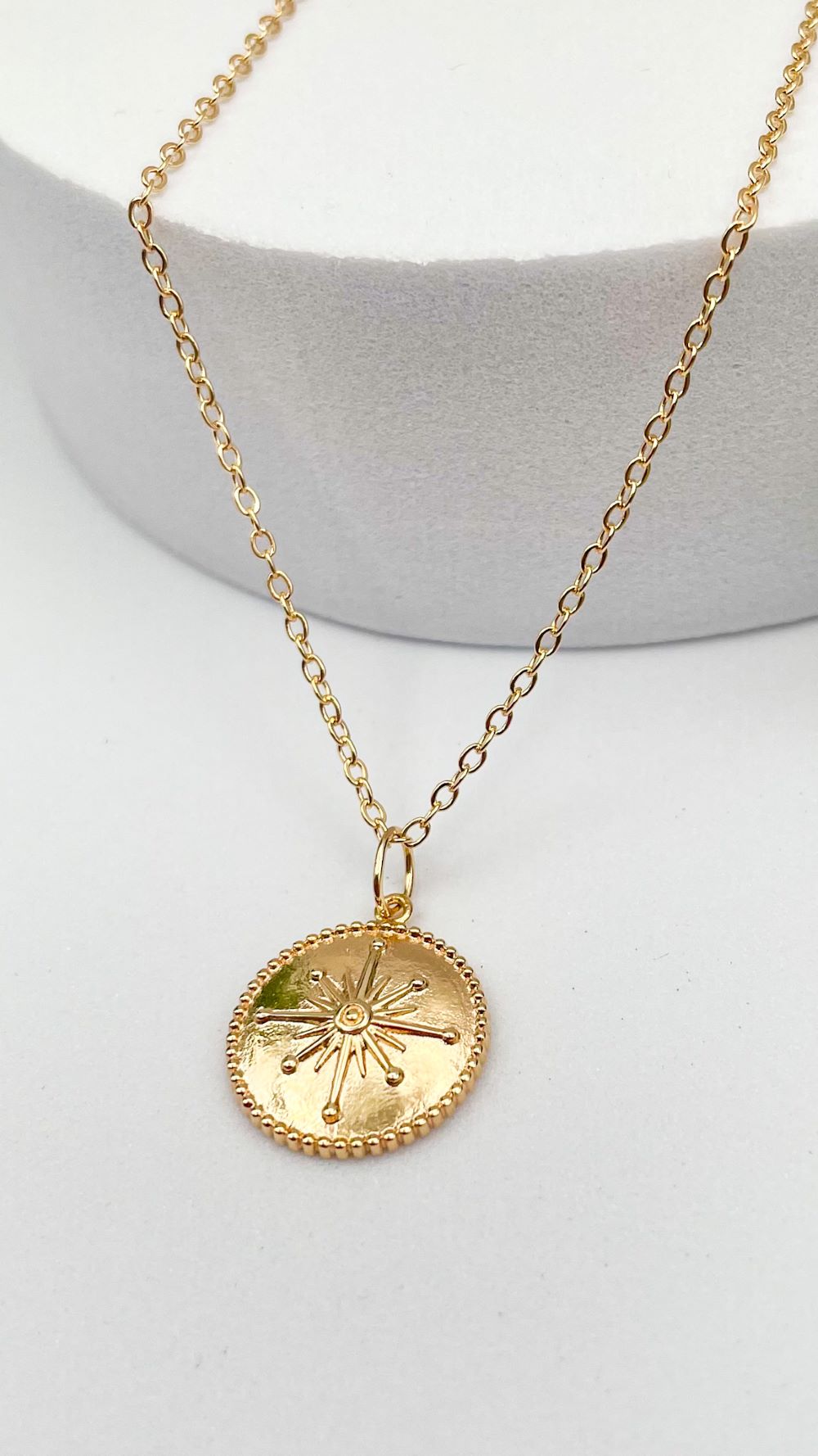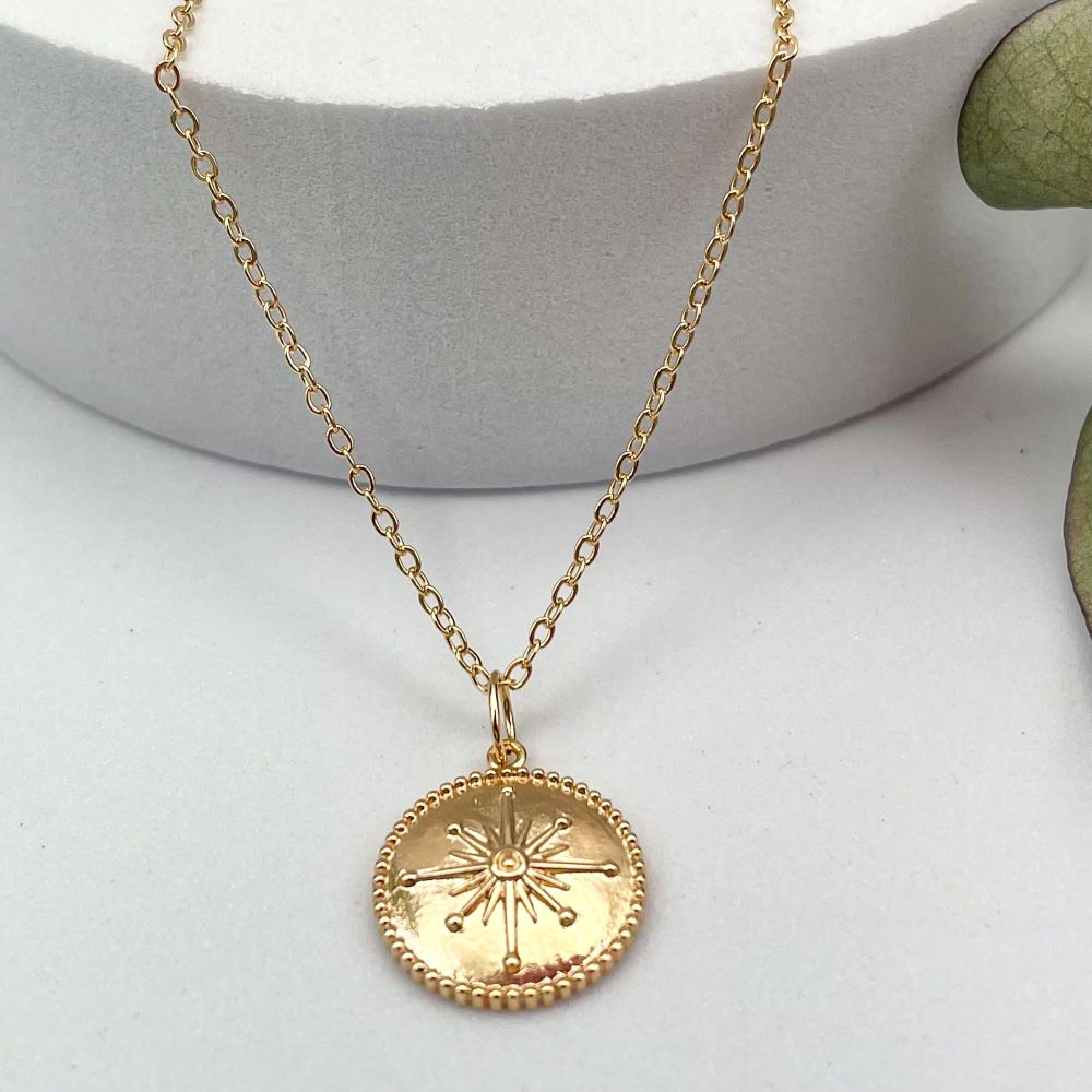 Ce collier présente un pendentif rond en plaqué or, délicatement orné d’une gravure en forme d’étoile. Chaque rayon de l’étoile est finement dessiné pour capturer et refléter la lumière, créant un effet scintillant et subtil. Le contour du médaillon est décoré d’une rangée de petites perles en relief, ajoutant une touche de texture et de sophistication au design global. Ce pendentif représente bien plus qu’un simple accessoire : il incarne la féminité.