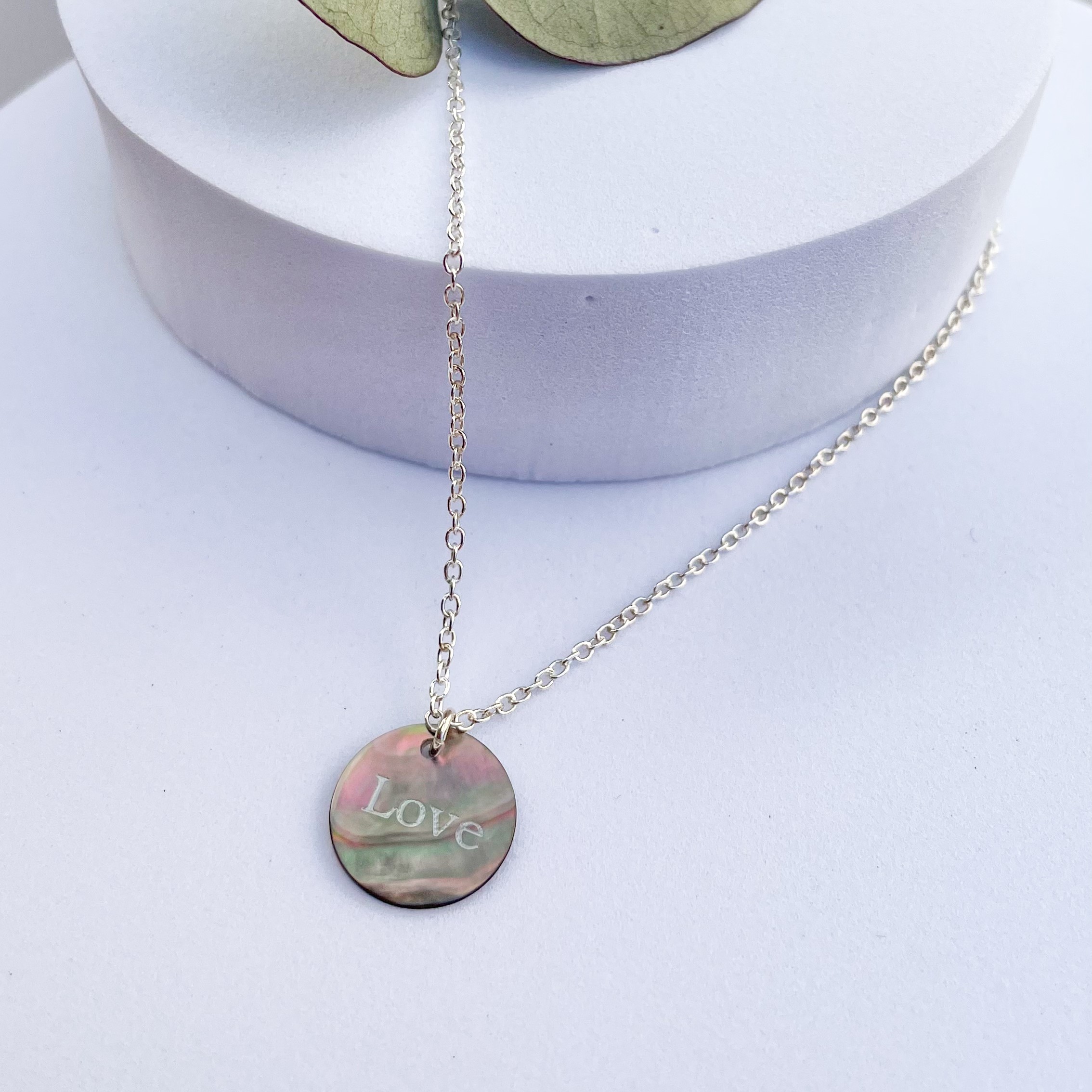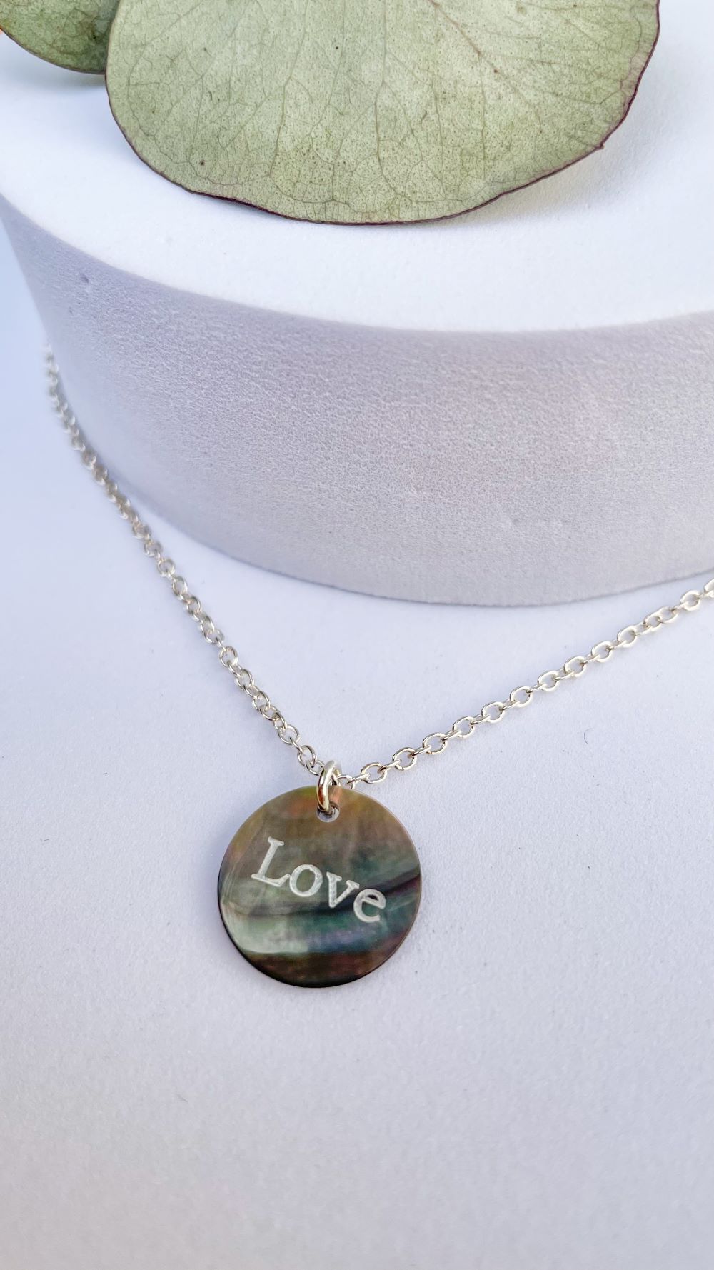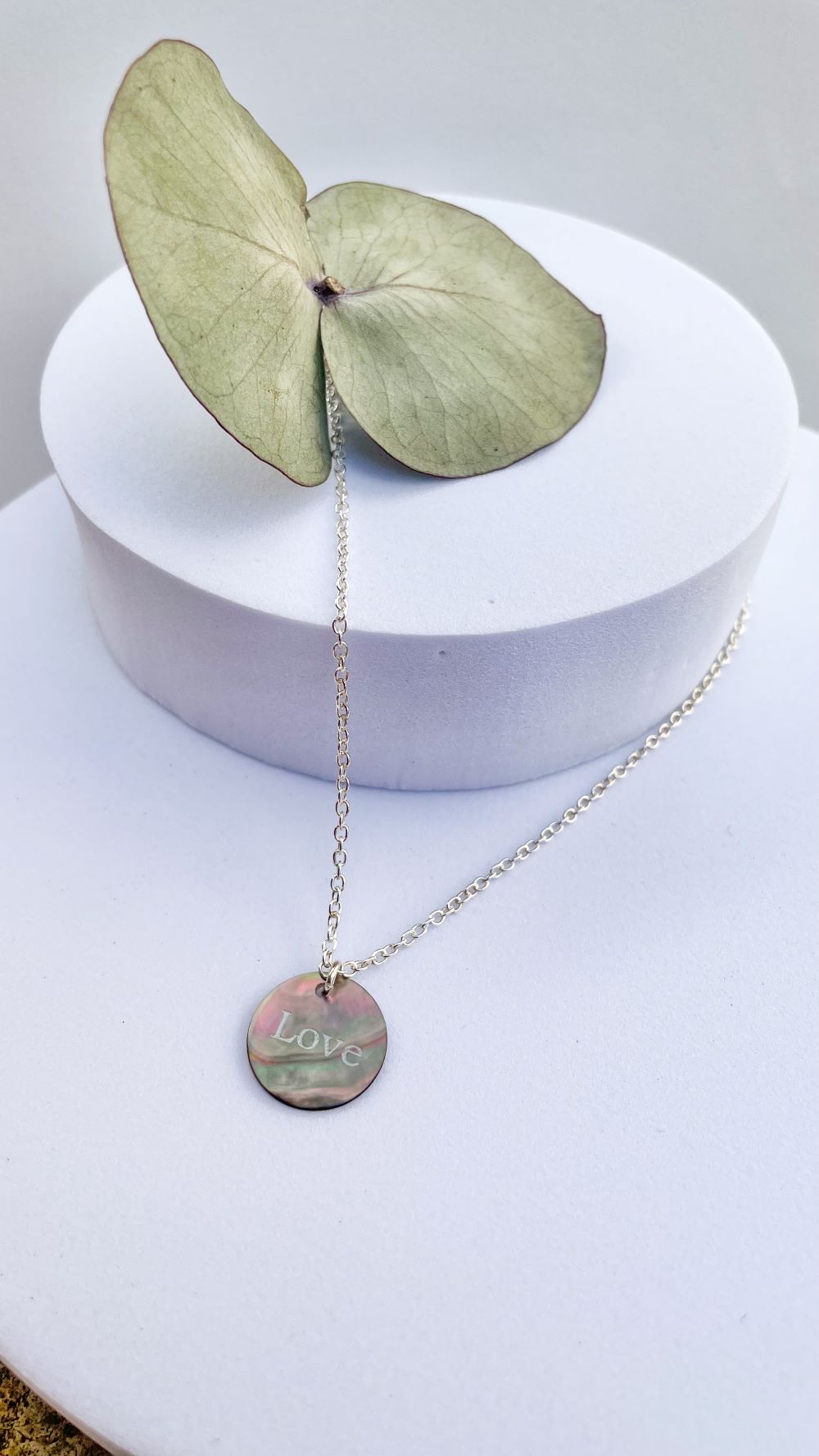Ce collier en argent avec sa médaille en nacre gravée du mot « Love » est un cadeau parfait pour toute personne chère à votre cœur. Offrez-le à un être aimé pour célébrer un moment spécial, comme un anniversaire, un anniversaire de mariage ou la Saint-Valentin. Il conviendra également à une amie précieuse, une mère pour la fête des mères, ou même à soi-même, pour symboliser un lien profond et sincère.