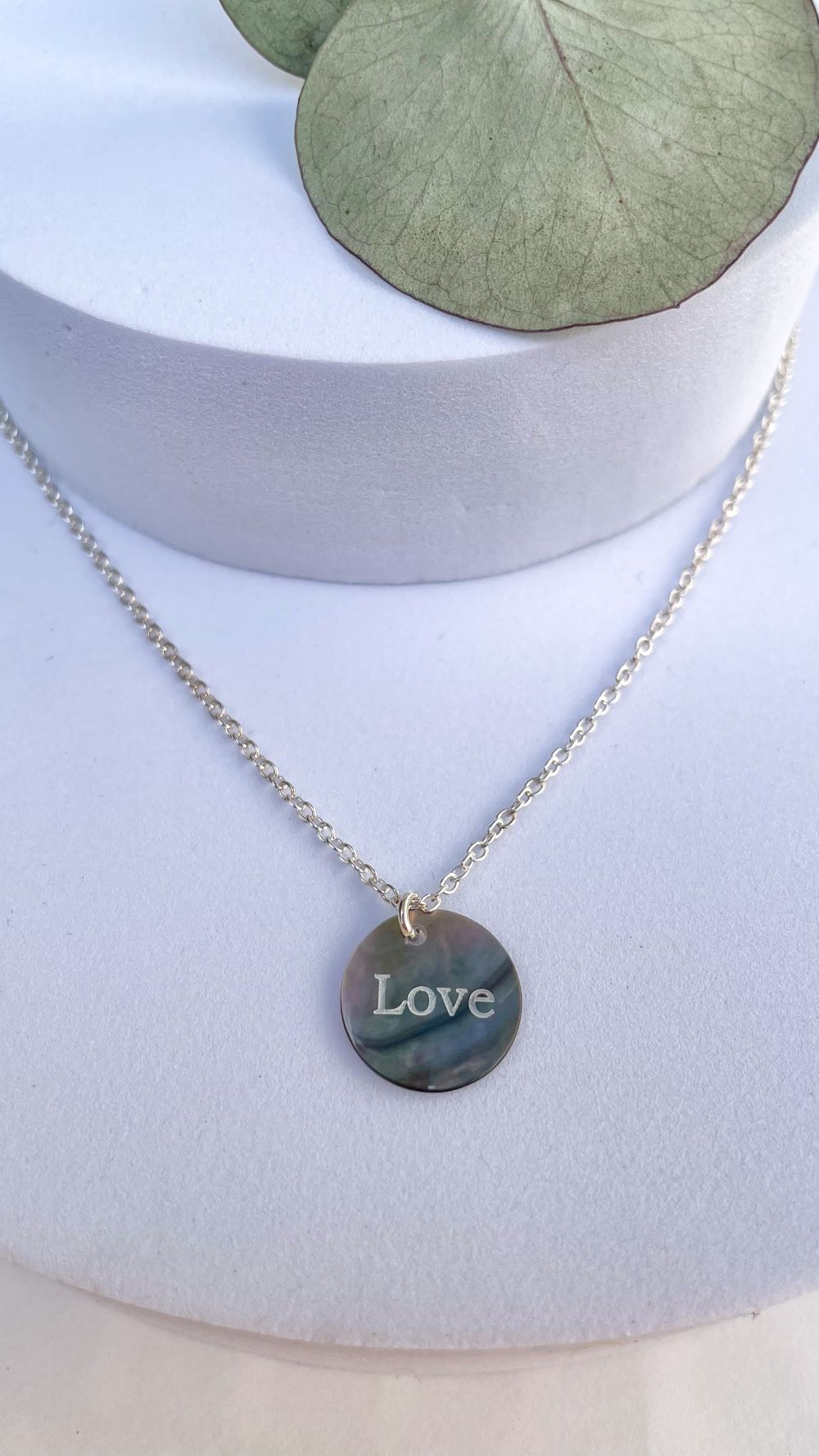 Ce collier en argent avec sa médaille en nacre grise gravée du mot « Love » est bien plus qu’un simple bijou, il symbolise une attention personnalisée et pleine de sens. La gravure délicate rend chaque pièce unique, offrant un message intime et universel. Le mot « Love », soigneusement inscrit sur la nacre aux reflets naturels et subtils, exprime l’affection, la tendresse ou un lien spécial à porter au plus près de soi. Ce collier personnalisé incarne à la fois élégance et émotion, parfait pour marquer une occasion particulière ou offrir un cadeau qui parle au cœur.