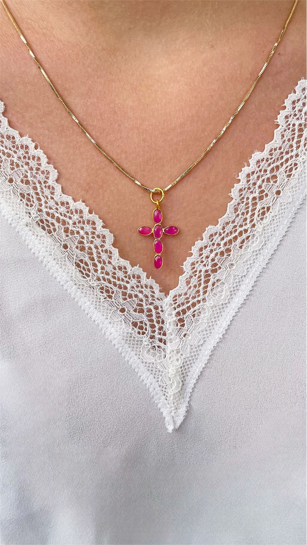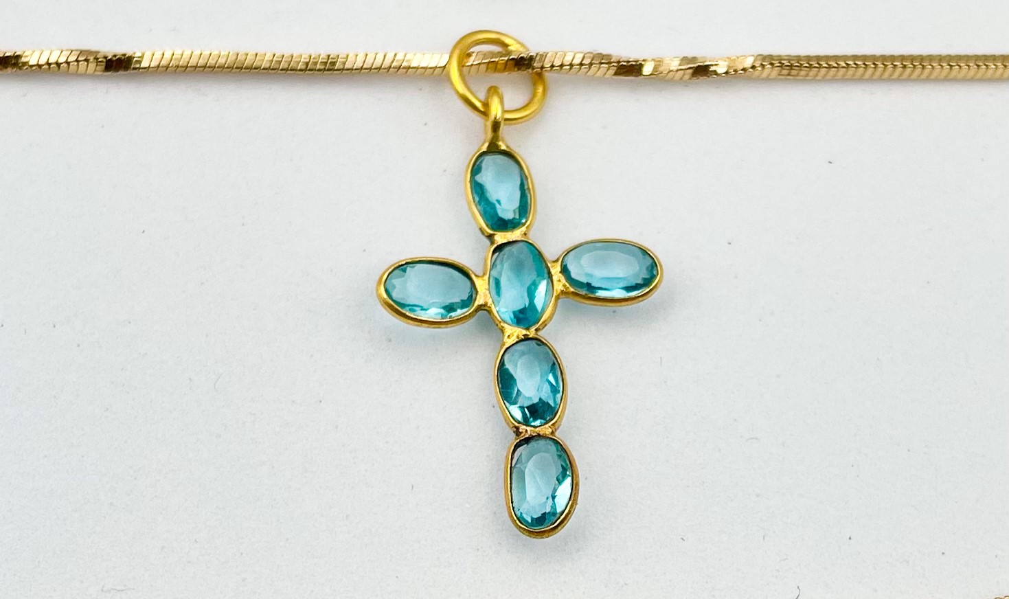 Découvrez notre chaîne originale en plaqué or, une création unique qui allie tradition et modernité. Sa maille torsadée élégante et sa croix sertie de gemmes précieuses (lapis lazuli, calcédoine rose, calcédoine verte et topaze) en font une pièce lumineuse et pleine de symboles. C’est le bijou chrétien moderne par excellence !