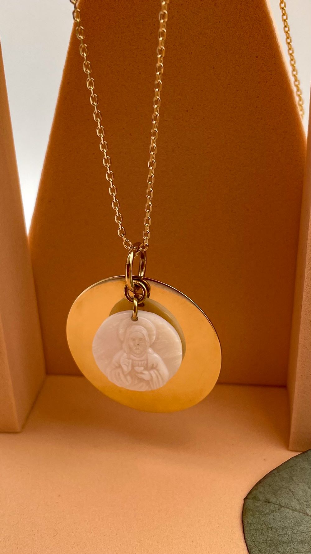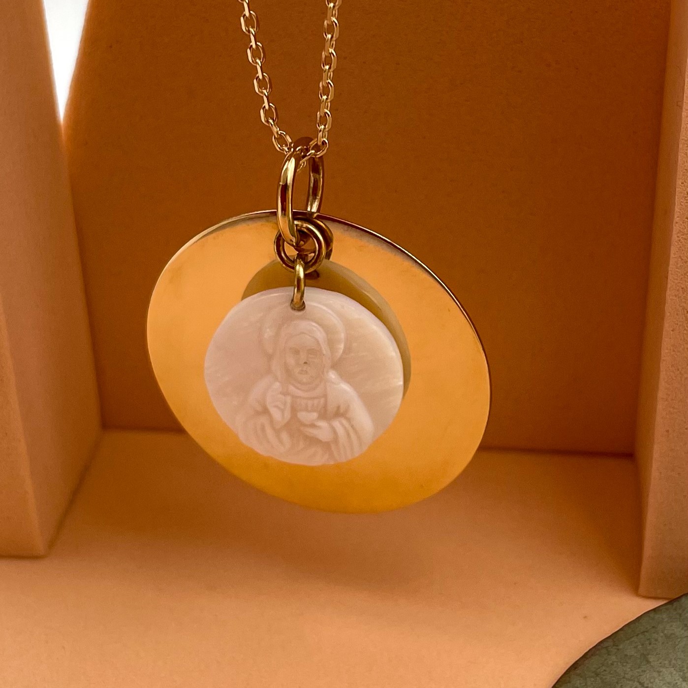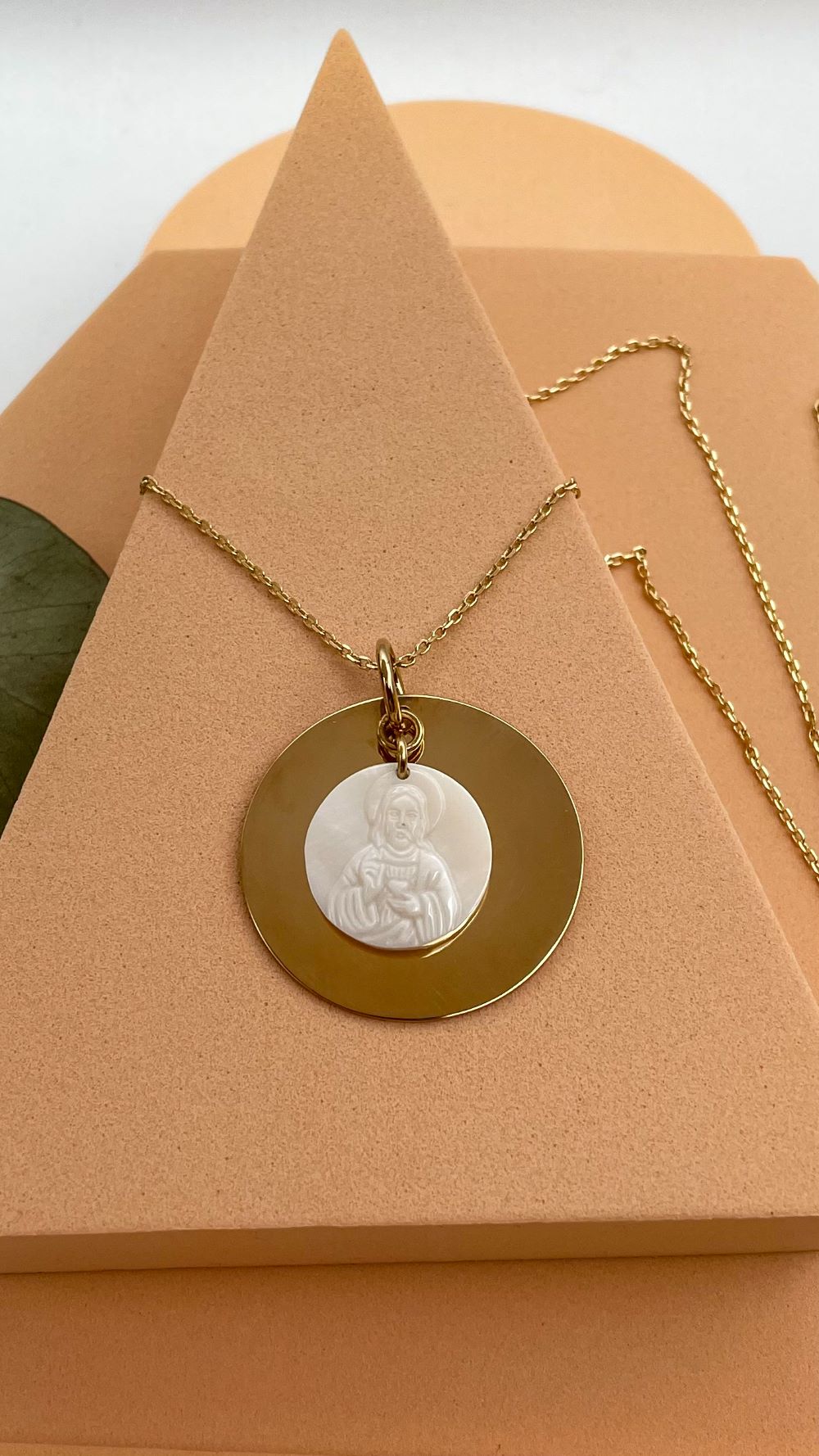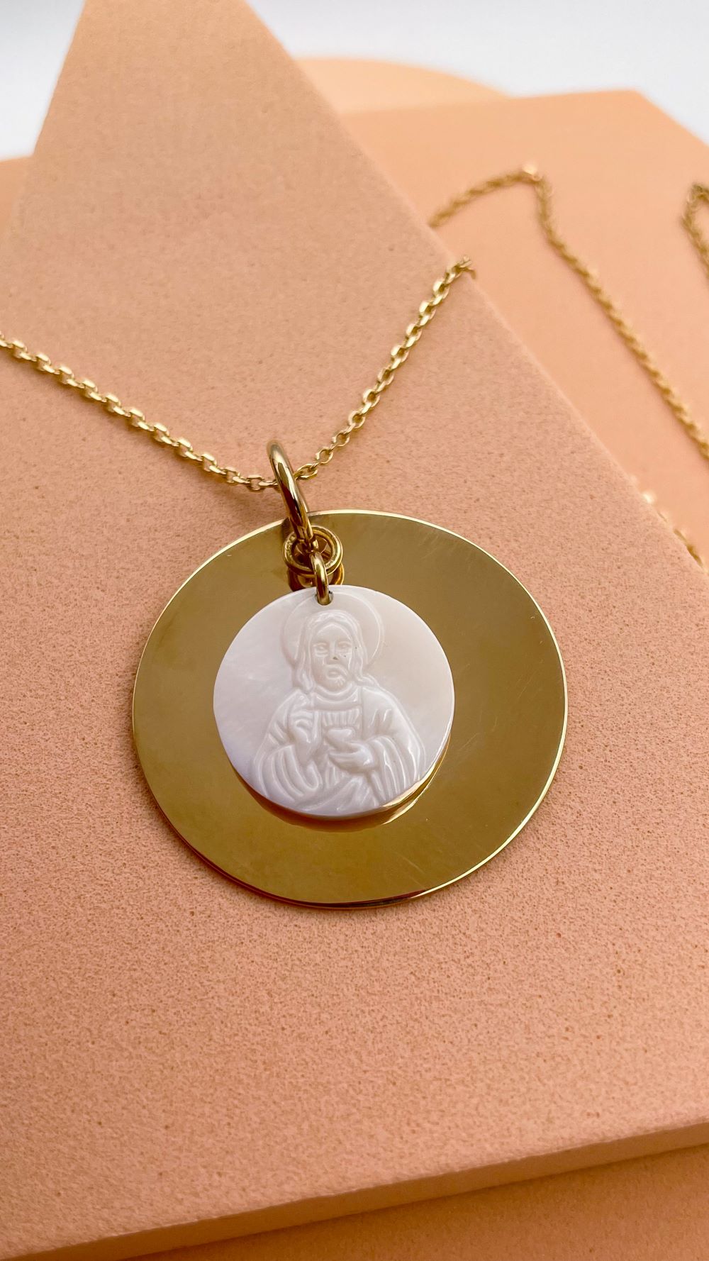 Ce magnifique sautoir en plaqué or est un bijou chrétien moderne, élégant et chargé de sens. Il se distingue par une grande médaille en plaqué or, ornée d’une seconde médaille délicatement posée en nacre. Cette dernière représente Jésus dévoilant son Sacré-Cœur, un symbole fort de l’amour divin et de la dévotion chrétienne.